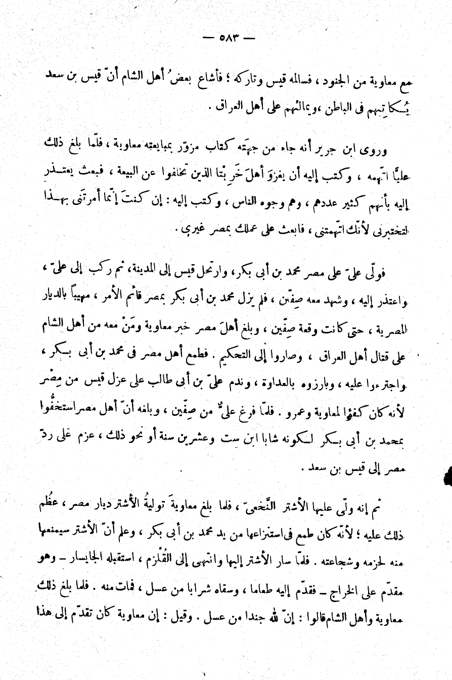 فولى على مصر محمد بن أبي بكر، وارتحل قيس إلى المدينة، ثم ركب إلى علي، واعتذر إليه، وشهد معه صفين، فلم يزل محمد بن أبي بكر بمصر قائم الأمر، مهيبا بالديار المصري، حتى كانت وقعة صفين، وبلغ أهل مصر خبر معاوية ومن معه من أهل الشام على قتال أهل العراق، وصاروا إلى التحكيم. فطمع أهل مصر في محمد بن أبي بكر، واجترءوا عليه، وبارزوه بالعداوة، وندم علي بن أبي طالب على عزل قيس من مصر لأنه كان كفئا لمعاوية وعمرو. فلما فرغ علي من صفين، وبلغه أن أهل مصر استخفوا بمحمد بن أبي بكر لكونه شابا ابن ست وعشرين سنة أو نحو ذلك، عزم على رد مصر إلى قيس بن سعد.