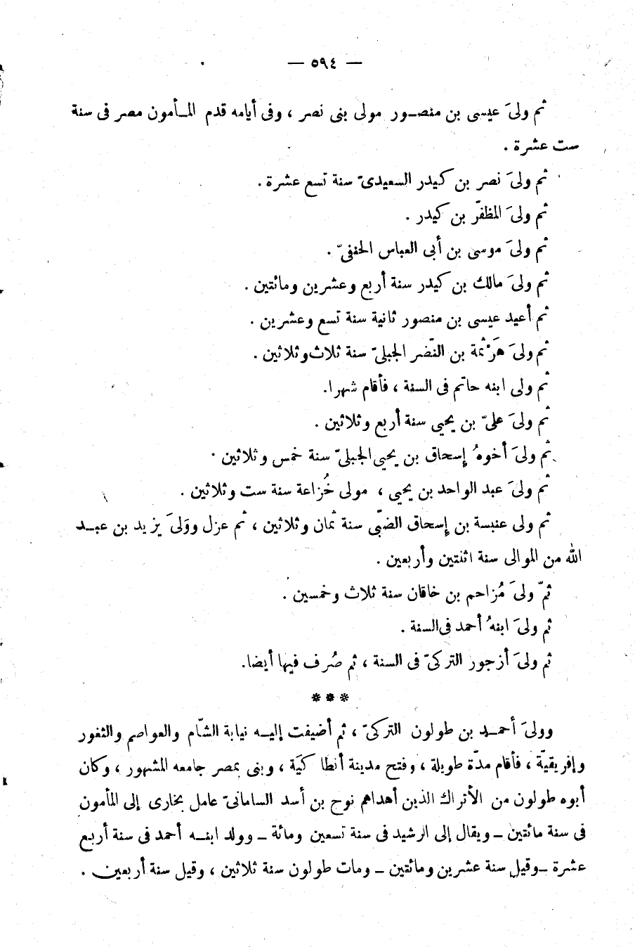 وولي أحمد بن طولون التركي، ثم أضيفت إليه نيابة الشام والعواصم والثغور وإفريقية، فأقام مدة طويلة، وفتح مدينة أنطاكية، وبنى بمصر جامعه المشهور، وكان أبوه طولون من الأتراك الذين أهداهم نوح بن أسد الساماني عامل بخارى إلى المأمون في سنة مائتين -ويقال إلى الرشيد في سنة تسعين ومائة- وولد ابنه أحمد في سنة أربع عشرة -وقيل: عشرين ومائتين- ومات طولون سنة ثلاثين، وقيل: سنة أربعين.