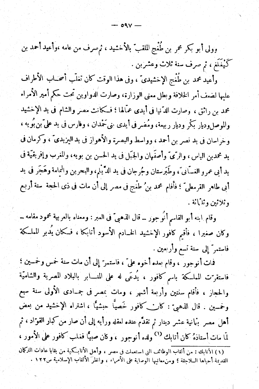 فمات أنوجور، وقام بعده أخوه علي، فاستمر إلى أن مات سنة خمس وخمسين؛ فاستقرت المملكة باسم كافور، يدعى له على المنابر بالبلاد المصرية والشامية والحجاز، فأقام سنتين وأربعة أشهر، ومات بمصر في جمادى الأولى سنة سبع وخمسين. قال الذهبي: كان كافور خصيًّا حبشيًّا، اشتراه الإخشيد من بعض أهل مصر بثمانية عشر دينار ثم تقدم عنده لعقله ورأيه إلى أن صار من كبار القواد، ثم لما مات أستاذه كان أتابك (¬1) ولده أنوجور، وكان صبيًّا فغلب كافور على الأمور،