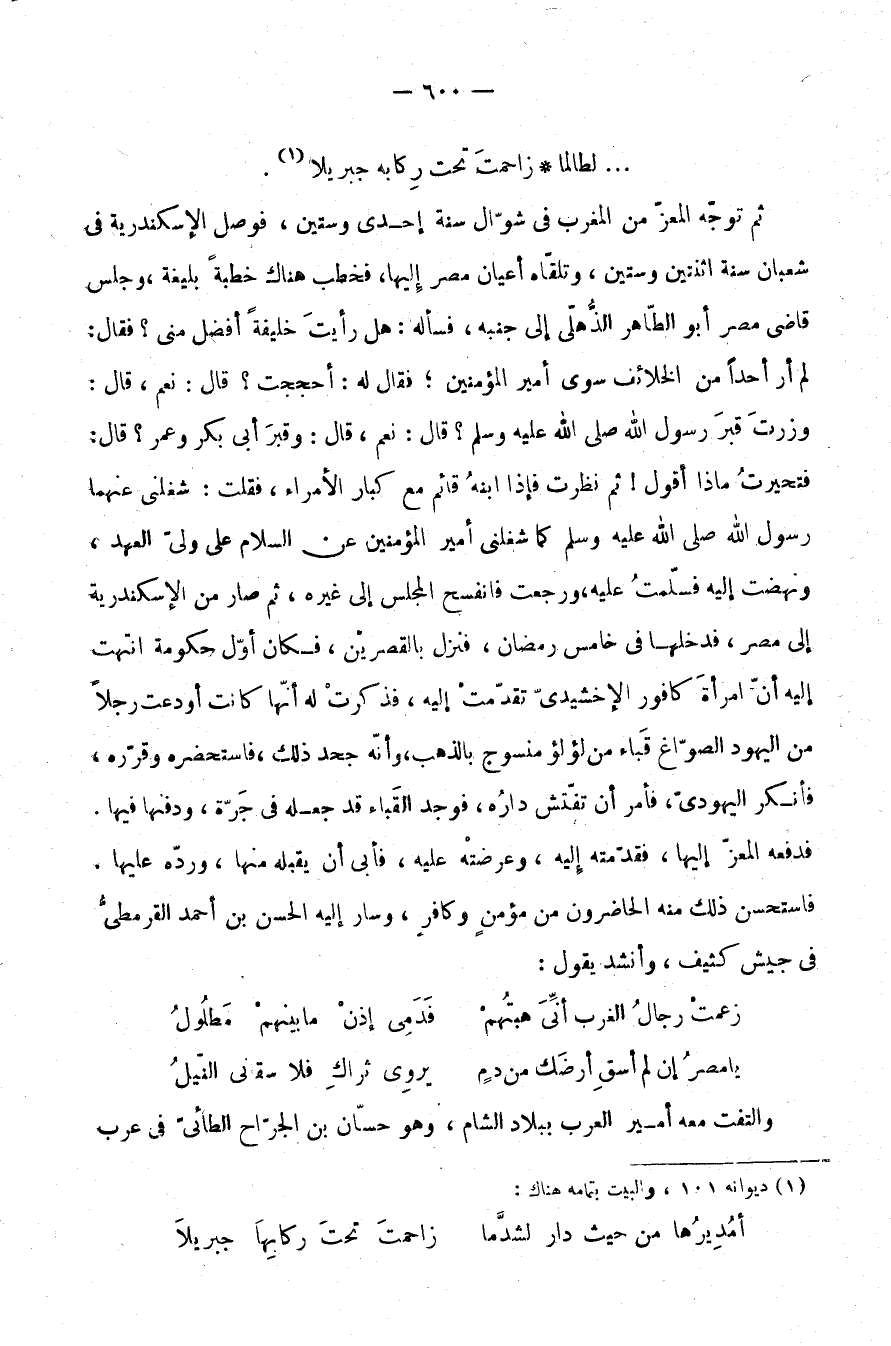 ثم توجه المعز من المغرب في شوال سنة إحدى وستين، فوصل الإسكندرية في شعبان سنة اثنتين وستين، وتلقاه أعيان مصر إليها، فخطب هناك خطبةً بليغة، وجلس قاضي مصر أبو الطاهر الذهلي إلى جنبه، فسأله: هل رأيت خليفةً أفضل مني؟ فقال: لم أر أحدًا من الخلائف سوى أمير المؤمنين؛ فقال له: أحججت؟ قال: نعم، قال: وزرت قبر رسول الله صَلَّى اللَّهُ عَلَيْهِ وَسَلَّمَ؟ قال: نعم، قال: وقبر أبي بكر وعمر؟ قال: فتحيرت ماذا أقول! ثم نظرت فإذا ابنه قائم مع كبار الأمراء، فقلت: شغلني عنهما رسول الله صَلَّى اللَّهُ عَلَيْهِ وَسَلَّمَ كما شغلني أمير المؤمنين عن السلام على ولي العهد، ونهضت إليه فسلمت عليه، فانفسح المجلس إلى غيره، ثم صار من الإسكندرية إلى مصر، فدخلها في خامس رمضان، فنزل بالقصرين، فكان أول حكومة انتهت إليه أن امرأة كافور الإخشيدي تقدمت إليه، فذكرت له أنها كانت أودعت رجلًا من اليهود الصواغ قباء من لؤلؤ منسوج بالذهب، وأنه جحد ذلك، فاستحضره وقرره، فأنكر اليهودي، فأمر أن تفتش داره، فوجد القباء قد جعله في جرة، ودفنها فيها. فدفعه المعز إليها، فقدمته إليه، وعرضته عليه، فأبى أن يقبله منها، ورده عليها. فاستحسن ذلك منه الحاضرون من مؤمن وكافر، وسار إليه الحسن بن أحمد القرمطي في جيش كثيف، وأنشد يقول: