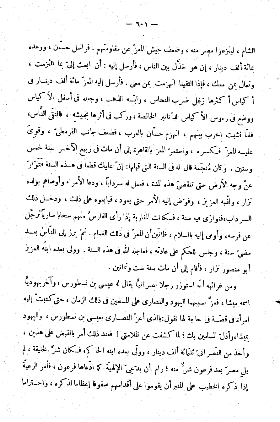 الشام، لينزعوا مصر منه، وضعف جيش المعز عن مقاومتهم. فراسل حسان، ووعده بمائة ألف دينار، إن هو خذَّل بين الناس، فأرسل إليه: أن ابعث إليّ بما التزمت، وتعال بمن معك، فإذا التقينا انهزمت بمن معي. فأرسل إليه المعز مائة ألف دينار في أكياس أكثرها زغل ضرب النحاس، ولبسه الذهب، وجعله في أسفل الأكياس ووضع في رءوس الأكياس الدنانير الخالصة، وركب في أثرها بجيشه، فالتقى الناس، فلما نشبت الحرب بينهم، انهزم حسان بالعرب، فضعف جانب القرمطي، وقوي عليه المعز فكسره، واستمر المعز بالقاهرة إلى أن مات في ربيع الآخر سنة خمس وستين. وكان منجمه قال له في السنة التي قبلها: إن عليك قطعًا في هذه السنة فتوار عن وجه الأرض حتى تنقضي هذه المدة، فعمل له سردابًا، ودعا الأمراء وأوصاهم بولده نزار، ولقبه العزيز، وفوض إليه الأمر حتى يعود، فبايعوه على ذلك، ودخل ذلك السرداب، فتوارى فيه سنة، فكانت المغاربة إذا رأى الفارس منهم سحابًا ساريًا ترجل عن فرسه، وأومى إليه بالسلام، ظانين أن المعز في ذلك الغمام. ثم برز إلى الناس بعد مضي سنة، وجلس للحكم على عادته، فعاجله الله في هذه السنة. وولي بعده ابنه العزيز أبو منصور نزار، فأقام إلى أن مات سنة ست وثمانين.