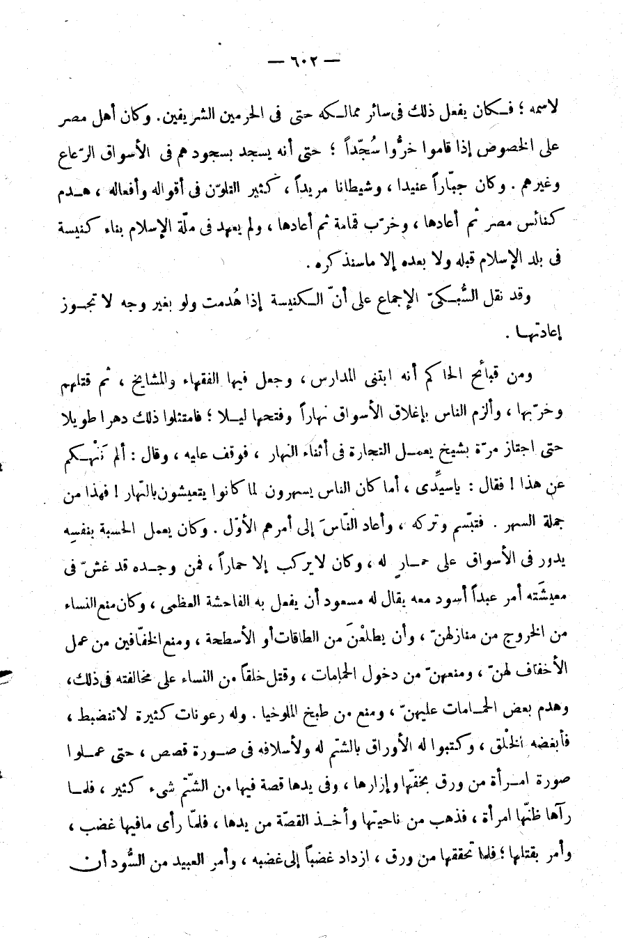لاسمه؛ فكان يفعل ذلك في سائر ممالكه حتى في الحرمين الشريفين. وكان أهل مصر على الخصوص إذا قاموا خروا سجدًا؛ حتى إنه يسجد بسجودهم في الأسواق الرعاع وغيرهم. وكان جبارًا عنيدًا، وشيطانًا مريدًا، كثير التلون في أقواله وأفعاله، هدم كنائس مصر ثم أعادها، وخرب قمامة ثم أعادها، ولم يعهد في ملة الإسلام بناء كنيسة في بلد الإسلام قبله ولا بعده إلا ما سنذكره.
