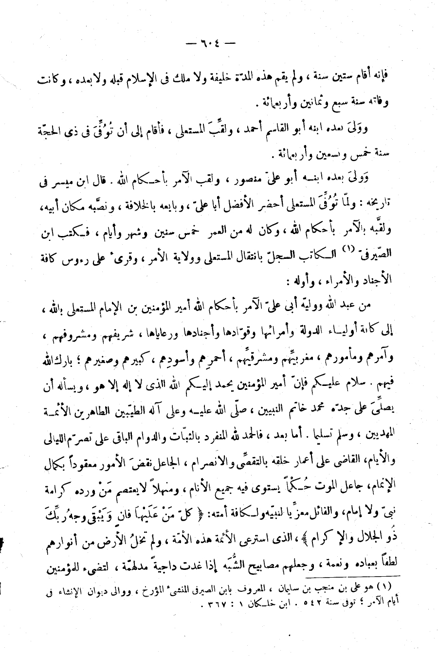 من عبد الله ووليه أبي علي الآمر بأحكام الله أمير المؤمنين بن الإمام المستعلي بالله، إلى كافة أولياء الدولة وأمرائها وقوادها وأجنادها ورعاياها، شريفهم ومشروفهم، وآمرهم ومأمورهم، مغربيهم ومشرقيهم، أحمرهم وأسودهم، كبيرهم وصغيرهم؛ بارك الله فيهم. سلام عليكم فإن أمير المؤمنين يحمد إليكم الله الذي لا إله إلا هو، يسأله أن يصلي على جده محمد خاتم النبيين، صلى الله عليه وعلى آله الطيبين الطاهرين الأئمة المهديين، وسلم تسليمًا، أما بعد، فالحمد لله المنفرد بالثبات والدوام الباقي على تصرم الليالي والأيام، القاضي على أعمار خلقه بالتقصي والانصرام، الجاعل نقض الأمور معقودًا بكمال الإتمام، جاعل الموت حكمًا يستوي فيه جميع الأنام، ومنهلًا لا يعتصم من ورده كرامة نبي ولا إمام، والقائل معزيًا لنبيه ولكافة أمته: {كُلُّ مَنْ عَلَيْهَا فَانٍ، وَيَبْقَى وَجْهُ رَبِّكَ ذُو الْجَلَالِ وَالْإِكْرَامِ} ، الذي استرعى الأئمة هذه الأمة، ولم تخل الأرض من أنوارهم لطفًا بعباده ونعمة، وجعلهم مصابيح الشبه إذا غدت داجية مدلهمة، لتضيء للمؤمنين