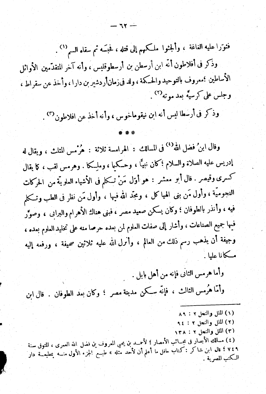 وقال ابن فضل الله (¬4) في المسالك: الهرامسة ثلاثة: هرمس المثلث، ويقال له إدريس عليه الصلاة والسلام؛ كان نبيا، وحكيما، وملكا. وهرمس لقب، كما يقال كسرى وقيصر. قال أبو معشر: هو أول من تكلم في الأشياء العلوية من الحركات النجومية، وأول من بنى الهياكل، ومجد الله فيها، وأول من نظر في الطب وتكلم فيه، وأنذر بالطوفان؛ وكان يسكن صعيد مصر، فبنى هناك الأهرام والبرابي، وصور فيها جميع الصناعات، وأشار إلى صفات العلوم لمن بعده حرصا منه على تخليد العلوم بعده، وخيفة أن يذهب رسم ذلك من العالم، وأنزل الله عليه ثلاثين صحيفة، ورفعه إليه مكانًا عليًّا.