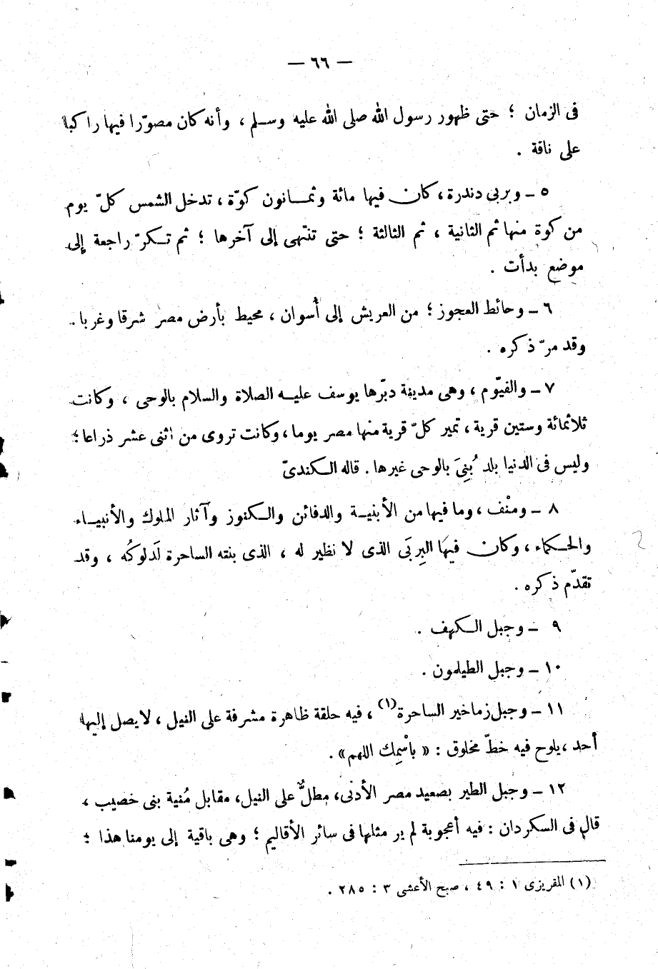 11- وجبل زماخير الساحرة (¬1) ، فيه حلقة ظاهرة مشرفة على النيل، لا يصل إليها أحد، يلوح فيه خط مخلوق: "باسمك اللهم".