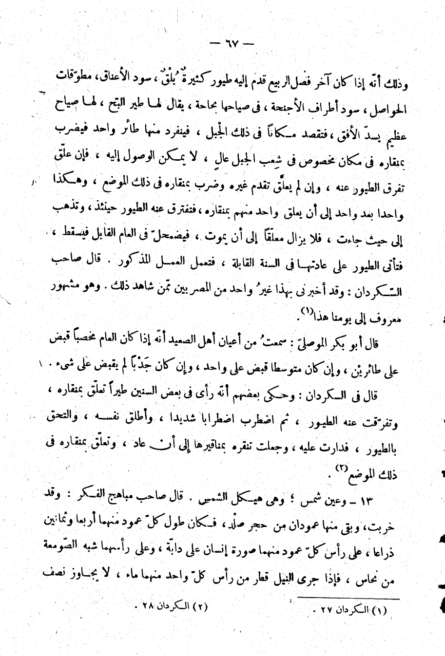 قال السكردان: وحكى بعضهم أنه رأى في بعض السنين طيرا تعلق بمنقاره، وتفرقت عنه الطيور، ثم اضطرب اضطرابا شديدا، وأطلق نفسه، والتحق بالطيور، فدارت عليه، وجعلت تنقره بمناقيرها إلى أن عاد، وتعلق بمنقاره في ذلك الموضع (¬2) .