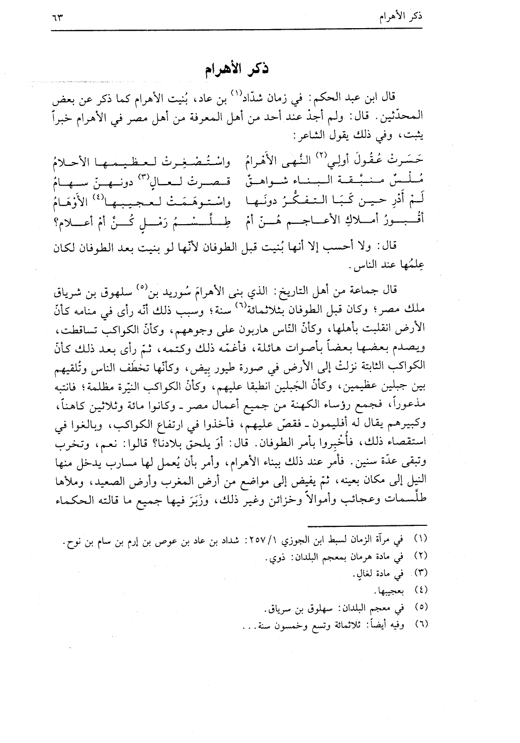 وكبيرهم يقال له أفليمون- فقص عليهم، فأخذوا في ارتفاع الكواكب، وبالغوا في استقصاء ذلك، فأخبروا بأمر الطوفان. قال: أويلحق بلادنا؟ قالوا: نعم، وتخرب وتبقى عدة سنين. فأمر عند ذلك ببناء الأهرام، وأمر بأن يعمل لها مسارب يدخل منها النيل إلى مكان بعينه، ثم يفيض إلى مواضع من أرض المغرب وأرض الصعيد، وملأها طلسمات