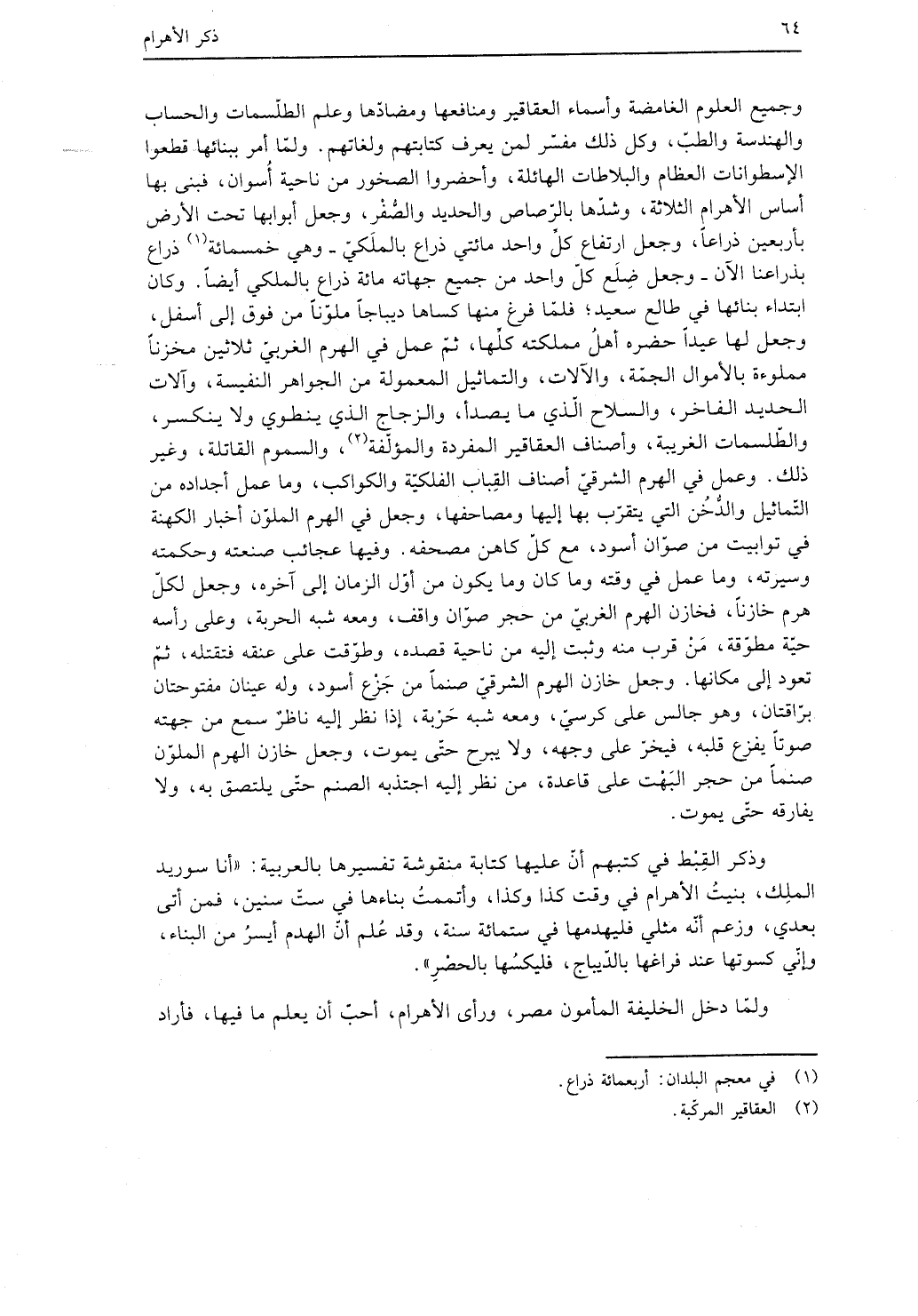 ولما دخل الخليفة المأمون مصر، ورأى الأهرام، أحب أن يعلم ما فيها، فأراد فتحها، فقيل له: إنك لا تقدر على ذلك، فقال: لا بد من فتح شيء منها، ففتحت له الثلمة المفتوحة الآن بنار توقد وخل يرش وحدادين يحدون الحديد ويحمونه، ومناجيق يرمى بها. وأنفق عليها مالًا عظيمًا حتى انفتحت، فوجد عرض الحائط عشرين ذراعًا؛ فلما انتهوا إلى آخر الحائط، وجدوا خلف النقب مطمرة من زبرجد أخضر، فيها ألف دينار، وزن كل دينار أوقية من أواقينا؛ فتعجبوا من ذلك، ولم يعرفوا معناه. فقال المأمون: ارفعوا إليَّ حساب ما أنفقتم على فتحها، فرفعوه؛ فإذا هو قدر الذي وجدوه، لا يزيد ولا ينقص، ووجدوا داخله بئر مربعة، في تربيعها أربعة أبواب، يُفضي كل باب منها إلى بيت فيه أموات بأكفانهم، ووجدوا في رأس الهرم بيتًا فيه حوض من الصخر، وفيه صنم كالآدمي من الدهنج (¬2) ، وفي وسطه إنسان عليه