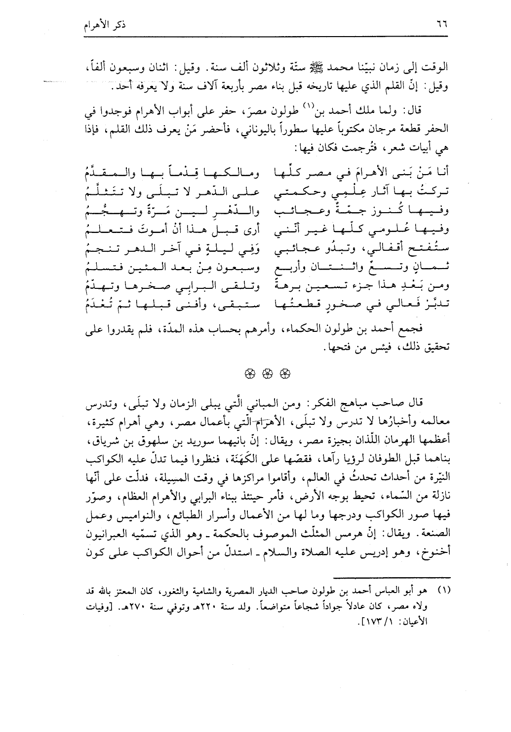 قال: ولما ملك أحمد بن طولون مصر، حفر على أبواب الأهرام فوجدوا في الحفر قطعة مرجان مكتوبًا عليها سطورًا باليوناني، فأحضر من يعرف ذلك القلم، فإذا هي أبيات شعر، فترجمت فكان فيها: