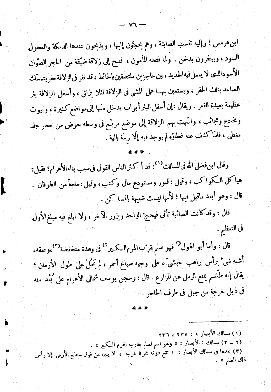 (¬3) بعدها في مسالك الأبصار: "يقع دونه شرقا بغرب، لا يبين من فوق سطح الأرض إلا رأس ذلك الصنم".