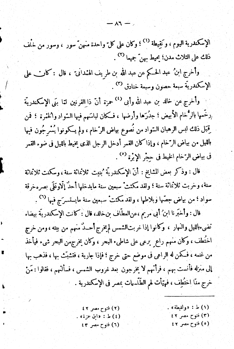 وأخرج ابن عبد الحكم عن عبد الله بن طريف الهمداني، قال: كان على الإسكندرية سبعة حصون وسبعة خنادق (¬3) .