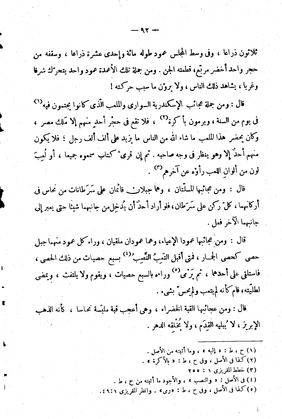 قال: ومن جملة عجائب الإسكندرية السواري والملعب الذي كانوا يجتمعون فيه (¬1) في يوم من السنة، ويرمون بأكرة (¬2) ، فلا تقع في حجر أحد منهم إلا ملك مصر، وكان يحضر هذا الملعب ما شاء من الناس ما يزيد على ألف ألف رجل؛ فلا يكون منهم أحد إلا وهو ينظر في وجه صاحبه. ثم إن قرئ كتاب سمعوه جميعا، أو لعب لون من ألوان اللعب رأوه عن آخرهم (¬3) .