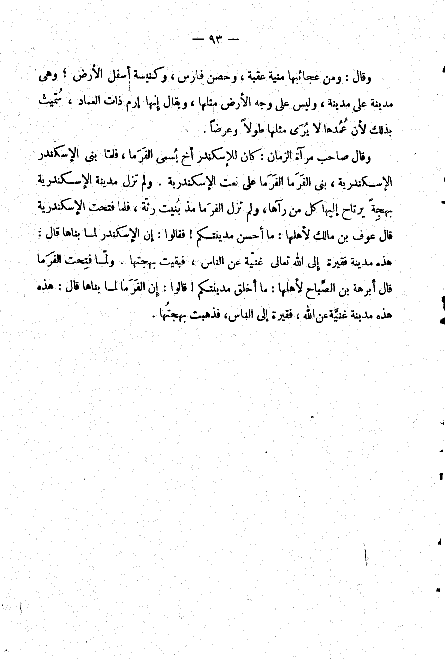 وقال: ومن عجائبها منية عقبة، وحصن فارس، وكنيسة أسفل الأرض؛ وهي مدينة على مدينة، وليس على وجه الأرض مثلها، ويقال إنها إرم ذات العماد، سميت بذلك لأن عمدها لا يُرى مثلها طولا وعرضا.