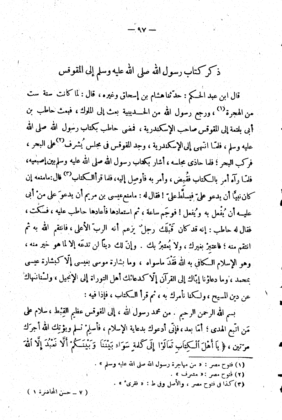 بسم الله الرحمن الرحيم. من محمد رسول الله إلى المقوقس عظيم القبط، سلام على من اتبع الهدى؛ أما بعد، فإني أدعوك بدعاية الإسلام، فأسلم تسلم ويؤتك الله أجرك مرتين، {يَا أَهْلَ الْكِتَابِ تَعَالَوْا إِلَى كَلِمَةٍ سَوَاءٍ بَيْنَنَا وَبَيْنَكُمْ أَلَّا نَعْبُدَ إِلَّا اللَّهَ