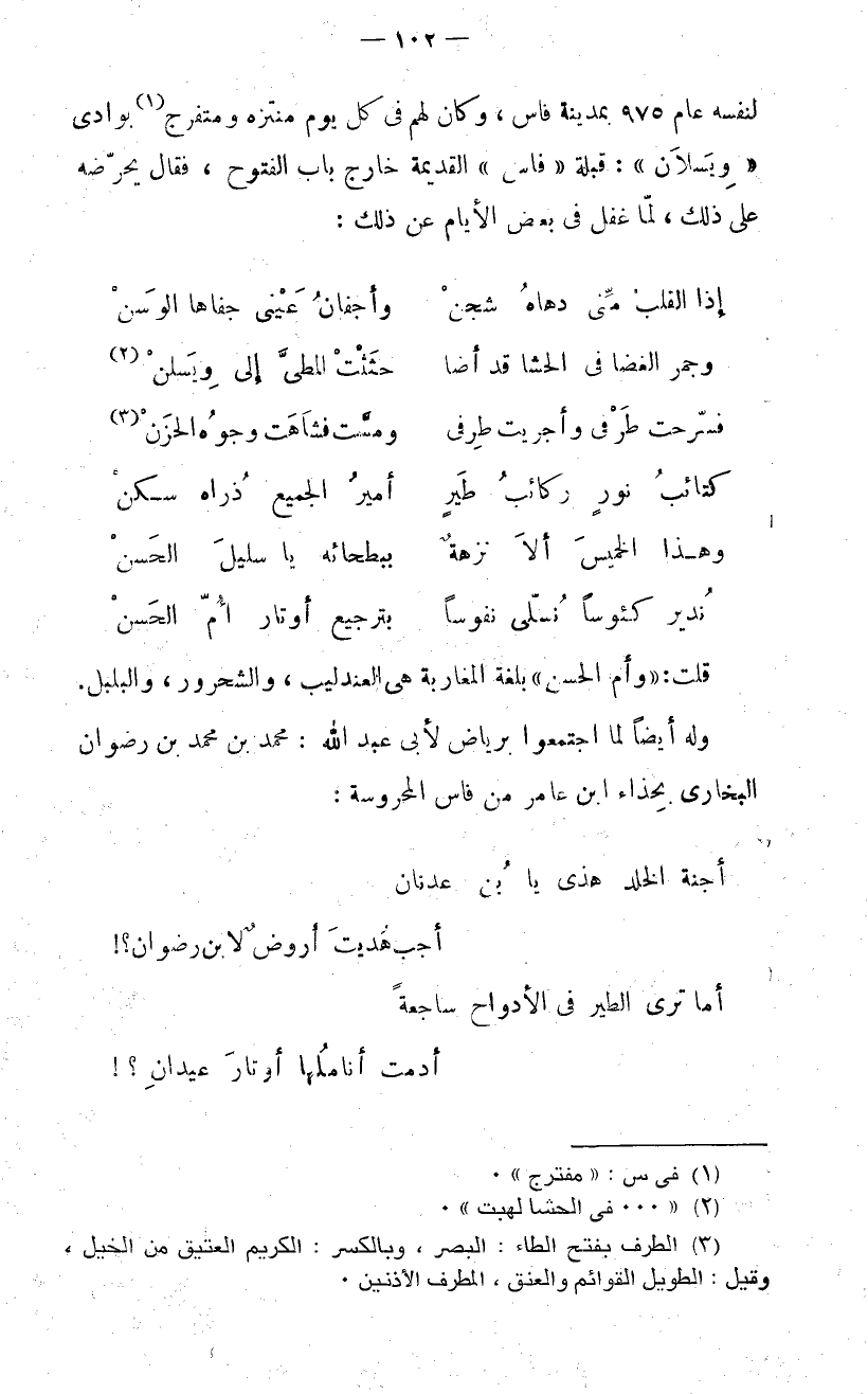 لنفسه عام 975 بمدينة فاس، وكان لهم فى كل يوم منتزه ومتفرج (1) بوادى «وبسلان»: قبلة «فاس» القديمة خارج باب الفتوح، فقال يحرّضه على ذلك، لمّا غفل فى بعض الأيام عن ذلك:
