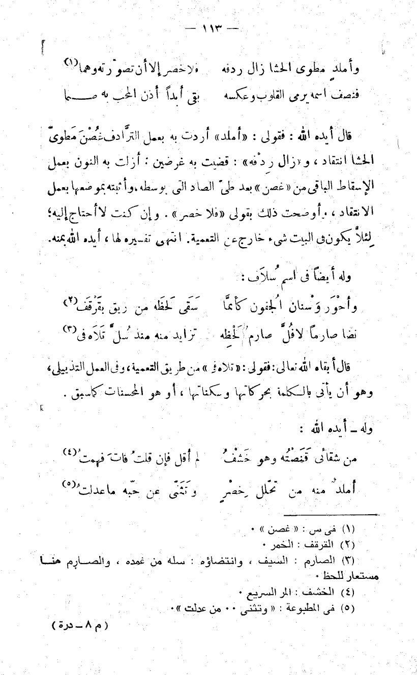 قال أيده الله: فقولى: «أملد» أردت به بعمل التّرادف غصن مطوىّ الحشا انتقاد، و «زال ردفه»: قضيت به غرضين: أزلت به النون بعمل الإسقاط الباقى من «غصن» بعد طىّ الصاد التى بوسطه، وأثبته بموضعها بعمل الانتقاد، وأوضحت ذلك بقولى «فلا خصر». وإن كنت لا أحتاج إليه؛ لئلاّ يكون فى البيت شئ خارج عن التعمية. انتهى تفسيره لها، أيده الله بمنه.