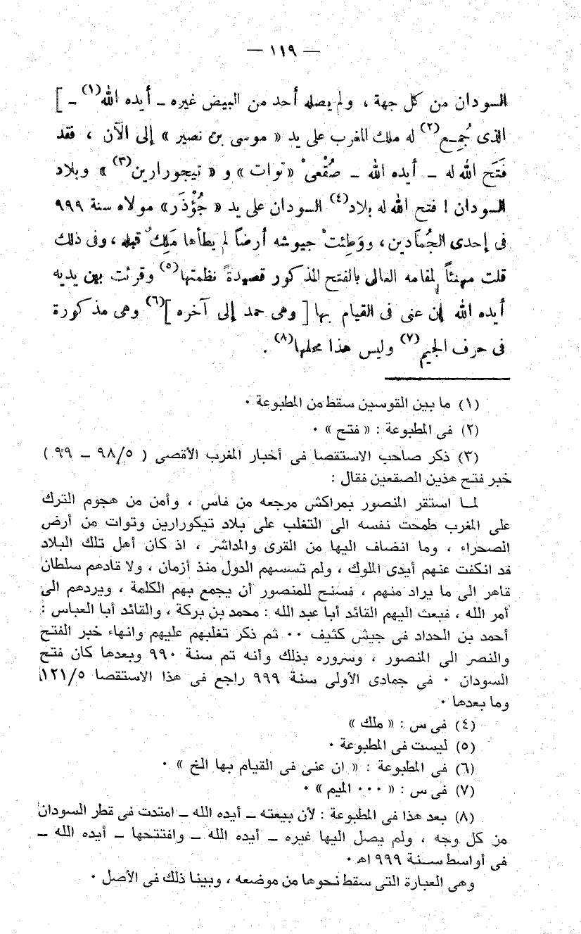 (8) بعد هذا فى المطبوعة: لأن بيعته-أيده الله-امتدت فى قطر السودان من كل وجه، ولم يصل اليها غيره-أيده الله-وافتتحها-أيده الله- فى أواسط سنة 999 اه. وهى العبارة التى سقط نحوها من موضعه، وبينا ذلك فى الأصل.