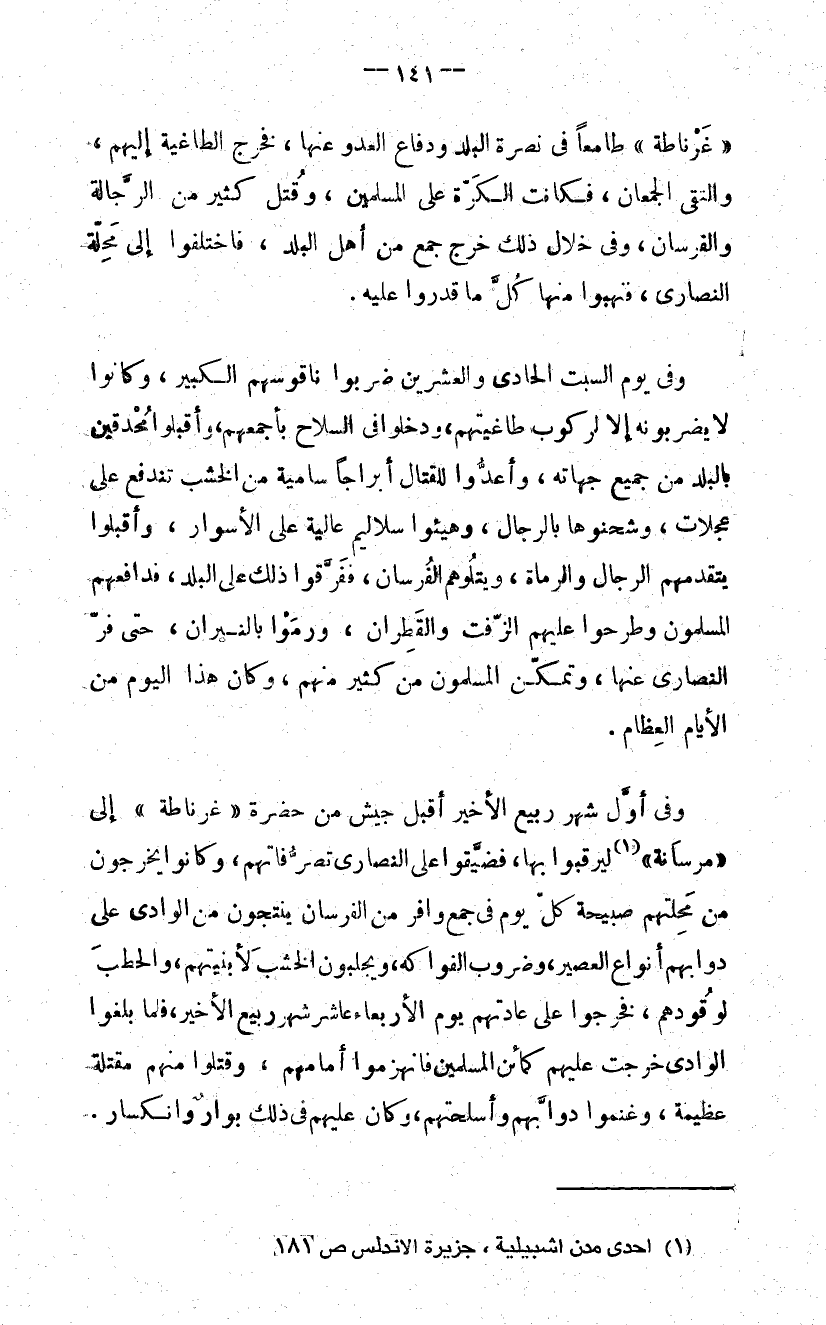 «غرناطة» طامعا فى نصرة البلد ودفاع العدو عنها، فخرج الطاغية إليهم، والتقى الجمعان، فكانت الكرّة على المسلمين، وقتل كثير من الرّجالة والفرسان، وفى خلال ذلك خرج جمع من أهل البلد، فاختلفوا إلى محلّة النصارى، فنهبوا منها كلّ ما قدروا عليه.