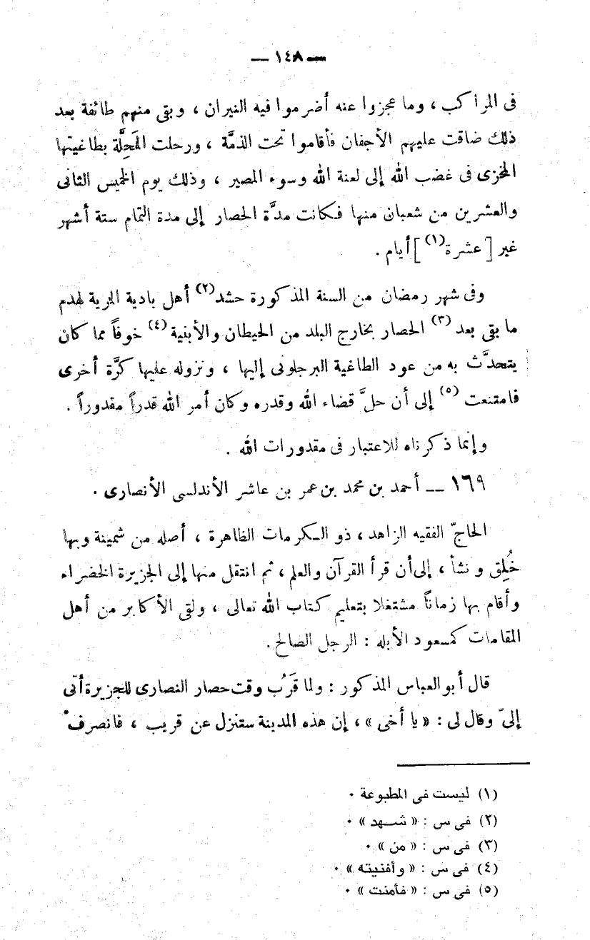 وفى شهر رمضان من السنة المذكورة حشد (2) أهل بادية المرية لهدم ما بقى بعد (3) الحصار بخارج البلد من الحيطان والأبنية (4) خوفا مما كان يتحدّث به من عود الطاغية البرجلوني إليها، ونزوله عليها كرّة أخرى فامتنعت (5) إلى أن حلّ قضاء الله وقدره وكان أمر الله قدرا مقدورا.