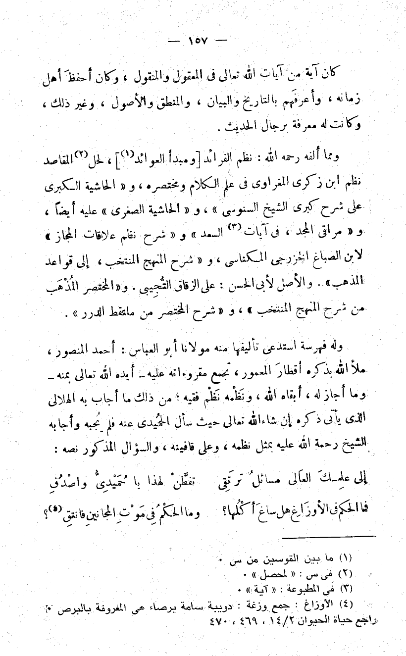 ومما ألفه رحمه الله: نظم الفرائد [ومبدأ العوائد (1)]، لحل (2) المقاصد نظم ابن زكرى المغراوى فى علم الكلام ومختصره، و «الحاشية الكبرى على شرح كبرى الشيخ السنوسى»، و «الحاشية الصغرى» عليه أيضا، و «مراقى المجد، فى آيات (3) السعد» و «شرح نظم علاقات المجاز» لابن الصباغ الخزرجى المكناسى، و «شرح المنهج المنتخب، إلى قواعد المذهب». والأصل لأبى الحسن: على الزقاق التّجيبى. و «المختصر المذهب من شرح المنهج المنتخب»، و «شرح المختصر من ملتقط الدرر».