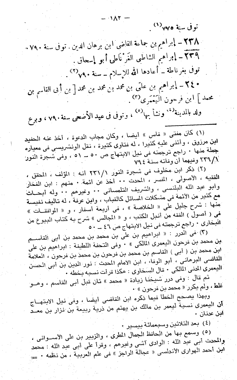 (3) فى الدرر: «ابراهيم بن على بن محمد بن محمد بن أبى القاسم بن محمد بن فرحون اليعمرى المالكى». وفى التحفة اللطيفة: ابراهيم بن على ابن محمد بن (أبى) القاسم بن محمد بن فرحون بن محمد بن فرحون، العلامة القاضى البرهانى، أبو الوفاء، ابن الامام المحدث: نور الدين بن أبى الحسن اليعمرى المدنى المالكى. قال السخاوى: هكذا قرأت نسبه بخطه. ثم قال: وفى درر شيخنا زيادة «محمد» ثان قبل أبى القاسم، وهو غلط، ولم يكرر «محمد بن فرحون». وبهذا يصحح الخطأ فيما ذكره ابن القاضى أيضا، وفى نيل الابتهاج أن اليعمرى نسبة ليعمر بن مالك بن بهثة من ذرية ربيعة بن نزار بن معد ابن عدنان.