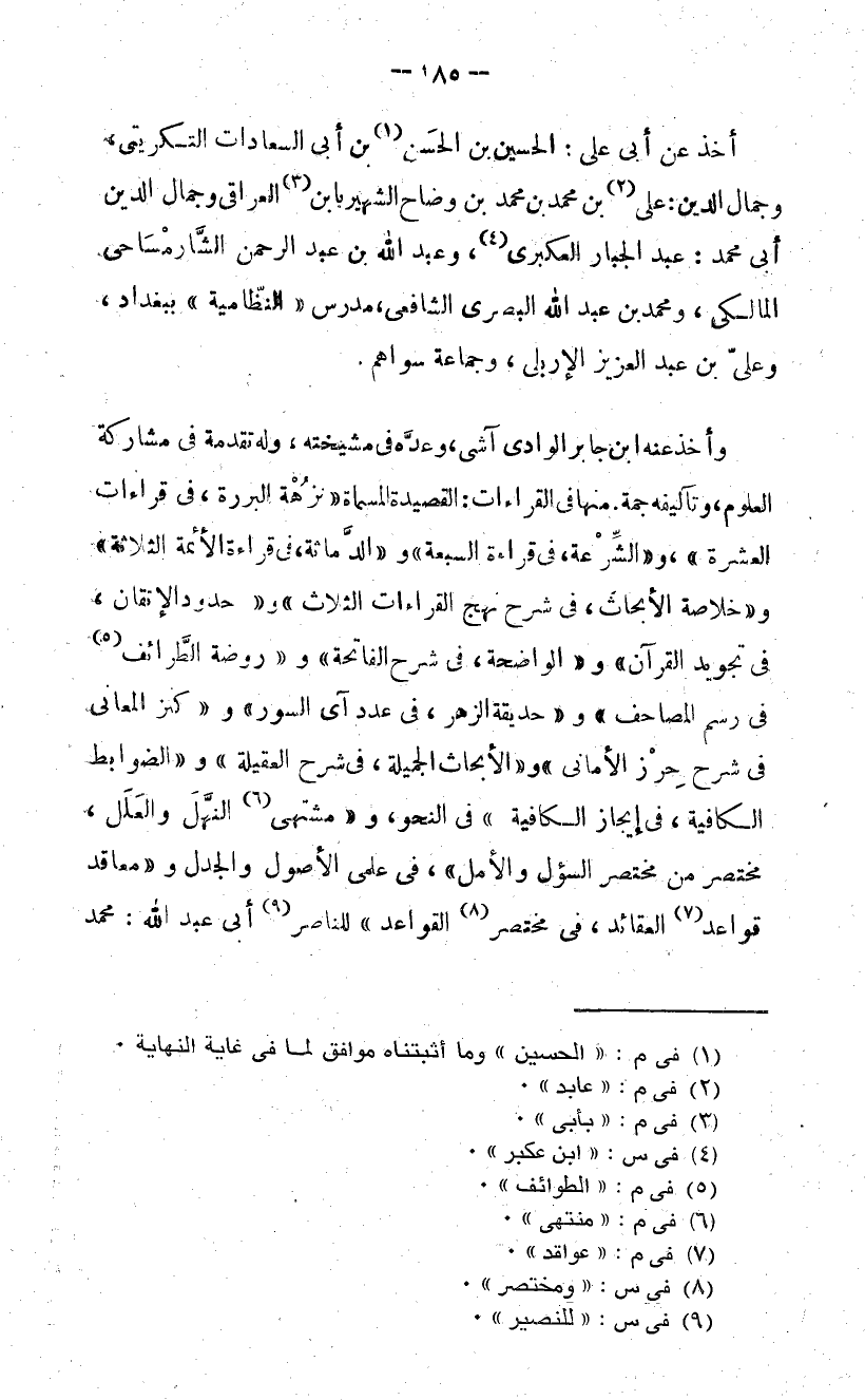 وأخذ عنه ابن جابر الوادى آشى، وعدّه فى مشيخته، وله تقدمة فى مشاركة العلوم، وتآليفه جمة. منها فى القراءات: القصيدة المسماة «نزهة البررة، فى قراءات العشرة»، و «الشّرعة، فى قراءة السبعة» و «الدّماثة، فى قراءة الأئمة الثلاثة» و «خلاصة الأبحاث، فى شرح نهج القراءات الثلاث» و «حدود الإتقان، فى تجويد القرآن» و «الواضحة، فى شرح الفاتحة» و «روضة الطّرائف (5) فى رسم المصاحف» و «حديقة الزهر، فى عدد آى السور» و «كنز المعانى فى شرح حرز الأمانى» و «الأبحاث الجميلة، فى شرح العقيلة» و «الضوابط الكافية، فى إيجاز الكافية» فى النحو، و «مشتهى (6) النهل والعلل، مختصر من مختصر السؤل والأمل»، فى علمى الأصول والجدل و «معاقد قواعد (7) العقائد، فى مختصر (8) القواعد» للناصر (9) أبى عبد الله: محمد