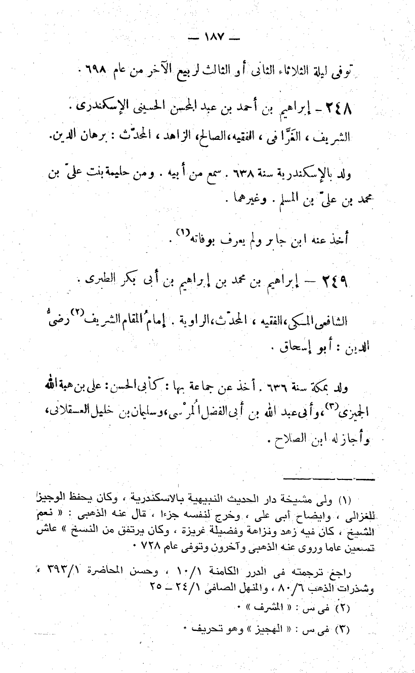 (1) ولى مشيخة دار الحديث النبيهية بالاسكندرية، وكان يحفظ الوجيز للغزالى، وايضاح أبى على، وخرج لنفسه جزءا، قال عنه الذهبى: «نعم الشيخ، كان فيه زهد ونزاهة وفضيلة غريزة، وكان يرتفق من النسخ» عاش تسعين عاما وروى عنه الذهبى وآخرون وتوفى عام 728. راجع ترجمته فى الدرر. الكامنة 1/ 10، وحسن المحاضرة 1/ 393، وشذرات الذهب 6/ 80، والمنهل الصافى 1/ 24 - 25