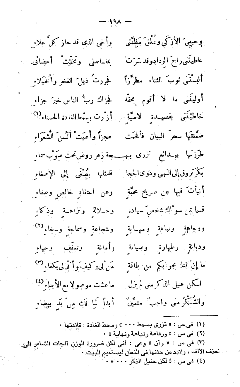 (3) فى س: «وأن» وهى: أنى لكن ضرورة الوزن ألجأت الشاعر الى حذف الألف، ولا بد من حذفها فى النطق ليستقيم البيت.