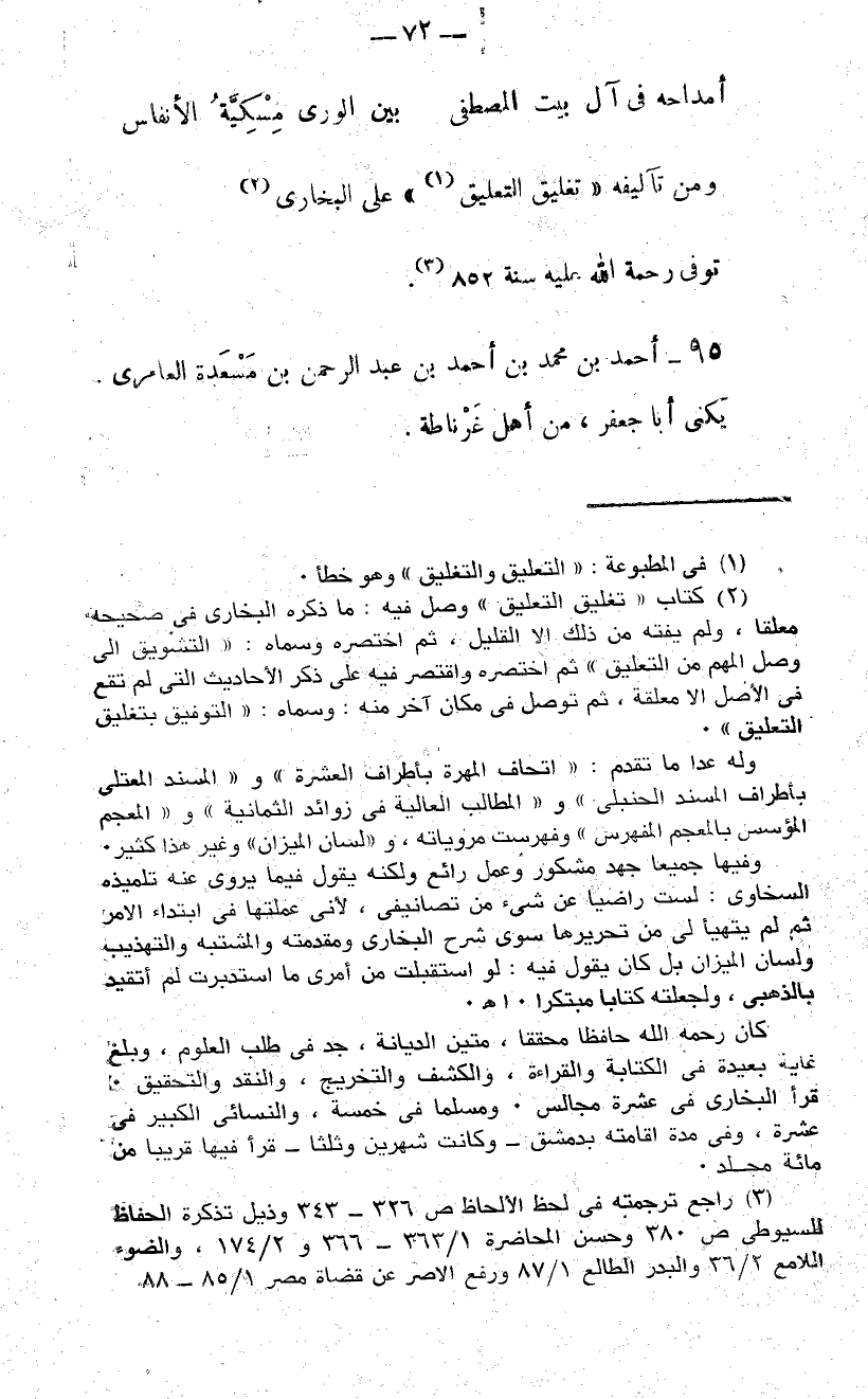 (2) كتاب «تغليق التعليق» وصل فيه: ما ذكره البخارى فى صحيحه معلقا، ولم يفته من ذلك الا القليل، ثم اختصره وسماه: «التشويق الى وصل المهم من التعليق» ثم اختصره واقتصر فيه على ذكر الأحاديث التى لم تقع فى الأصل الا معلقة، ثم توصل فى مكان آخر منه: وسماه: «التوفيق بتغليق التعليق». وله عدا ما تقدم: «اتحاف المهرة بأطراف العشرة» و «المسند المعتلى بأطراف المسند الحنبلى» و «المطالب العالية فى زوائد الثمانية» و «المعجم المؤسس بالمعجم المفهرس» وفهرست مروياته، و «لسان الميزان» وغير هذا كثير. وفيها جميعا جهد مشكور وعمل رائع ولكنه يقول فيما يروى عنه تلميذه السخاوى: لست راضيا عن شئ من تصانيفى، لأنى عملتها فى ابتداء الامر ثم لم يتهيأ لى من تحريرها سوى شرح البخارى ومقدمته والمشتبه والتهذيب ولسان الميزان بل كان يقول فيه: لو استقبلت من أمرى ما استدبرت لم أتقيد بالذهبى، ولجعلته كتابا مبتكرا. اه. كان رحمه الله حافظا محققا، متين الديانة، جد فى طلب العلوم، وبلغ غاية بعيدة فى الكتابة والقراءة، والكشف والتخريج، والنقد والتحقيق. قرأ البخارى فى عشرة مجالس. ومسلما فى خمسة، والنسائى الكبير فى عشرة، وفى مدة اقامته بدمشق-وكانت شهرين وثلثا-قرأ فيها قريبا من مائة مجلد.