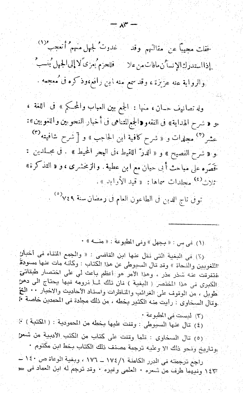 (5) قال السخاوى: قلما وقفت على كتاب من الكتب الأدبية من شعر وتاريخ ونحو ذلك الا وعليه ترجمة مصنف ذلك الكتاب بخط ابن مكتوم. راجع ترجمته فى الدرر الكامنة 1/ 174 - 176، وبغية الوعاة ص 140 - 143 وفيهما طرف من شعره. العلمى وغيره. وقد ترجم له ابن العماد فى-