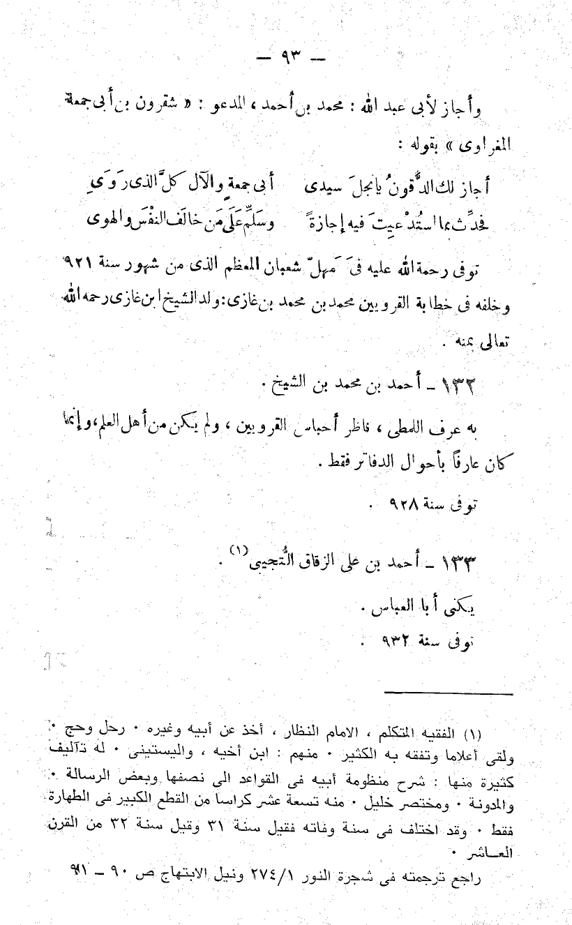(1) الفقيه المتكلم، الامام النظار، أخذ عن أبيه وغيره. رحل وحج. ولقى أعلاما وتفقه به الكثير. منهم: ابن أخيه، واليستينى. له تآليف كثيرة منها: شرح منظومة أبيه فى القواعد الى نصفها وبعض الرسالة. والمدونة. ومختصر خليل. منه تسعة عشر كراسا من القطع الكبير فى الطهارة فقط. وقد اختلف فى سنة وفاته فقيل سنة 31 وقيل سنة 32 من القرن العاشر. راجع ترجمته فى شجرة النور 1/ 274 ونيل الابتهاج ص 90 - 91.
