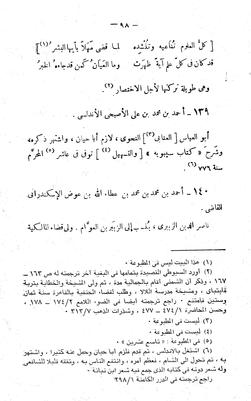 (6) اشتغل بالاندلس، ثم قدم فلزم أبا حيان وحمل عنه كثيرا، واشتهر به، ثم تحول الى الشام، فعظم أمره، وانتفع الناس به، وتفقه قليلا للشافعى وله شعر دونه فى كتابه الذى جمع فيه شعر ابن نباتة. راجع ترجمته فى الدرر الكامنة 1/ 298
