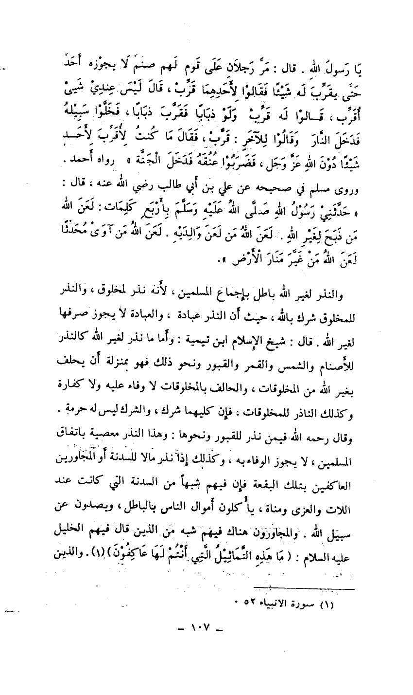 وقال رحمه الله فيمن نذر للقبور ونحوها: وهذا النذر معصية باتفاق المسلمين، لا يجوز الوفاء به، وكذلك إذا نذر مالا للسدنة أَو المجاورين العاكفين بتلك البقعة فإن فيهم شبهًا من السدنة التي كانت عند اللات والعزى ومناة، يأْكلون أَموال الناس بالباطل، ويصدون عن سبيل الله. والمجاورون هناك فيهم شبه من الذين قال فيهم الخليل عليه السلام: (مَا هَذِهِ التَّمَاثِيلُ الَّتِي أَنتُمْ لَهَا عَاكِفُونَ) (¬1) . والذين