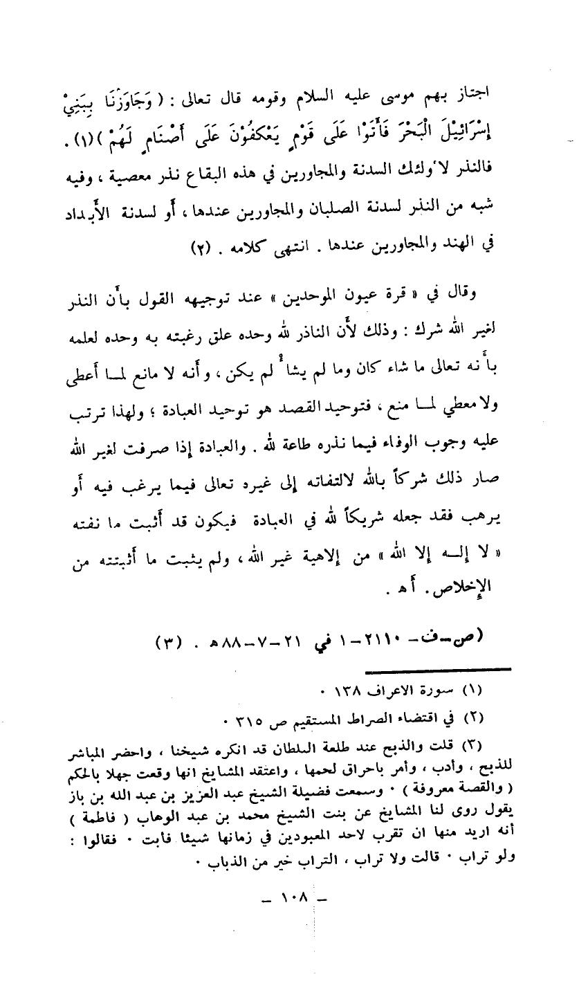 (¬3) قلت والذبح عند طلعة السلطان قد انكره شيخنا، واحضر المباشر للذبح، وأدب، وأمر باحراق لحمها، واعتقد المشايخ أنها وقعت جهلا بالحكم (والقصة معروفة) . وسمعت فضيلة الشيخ عبد العزيز بن عبد الله بن باز أَنه أريد منها أن تقرب لأحد المعبودين في زمانها شيئًا فأبت. فقالوا: ولو تراب. قالت ولا تراب، التراب خير من الذباب.