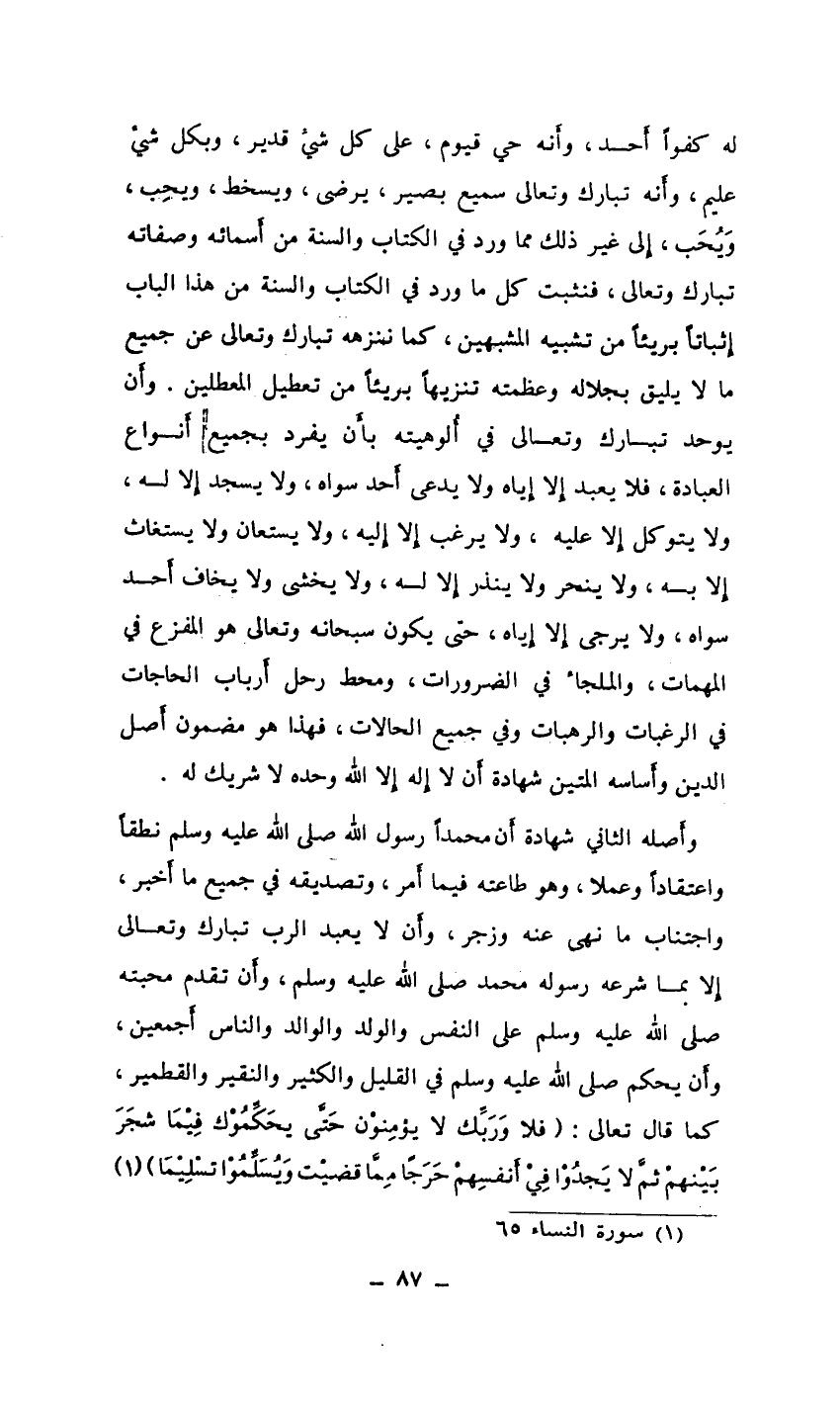له كفوا أحد، وأَنه حي قيوم، على كل شيء قدير، وبكل شيء عليم، وأَنه تبارك وتعالى سميع بصير، يرضى، ويسخط، ويحِب، وَيُحَب، إلى غير ذلك مما ورد في الكتاب والسنة من أَسمائه وصفاته تبارك وتعالى، فنثبت كل ما ورد في الكتاب والسنة من هذا الباب إثباتًا بريئًا من تشبيه المشبهين، كما ننزهه تبارك وتعالى عن جميع ما لا يليق بجلاله وعظمته تنزيهًا بريئًا من تعطيل المعطلين. وأَن يوحد تبارك وتعالى في أُلوهيته بأَن يفرد بجميع أَنواع العبادة، فلا يعبد إلا إياه ولا يدعى أَحد سواه، ولا يسجد إلا له، ولا يتوكل إلا عليه، ولا يرغب إلا إليه، ولا يستعان ولا يستغاث إلا به، ولا ينحر ولا ينذر إلا له، ولا يخشى ولا يخاف أَحد سواه، ولا يرجى إلا إياه، حتى يكون سبحانه وتعالى هو المفزع في المهمات، والملجأ في الضرورات، ومحط رحل أَرباب الحاجات في الرغبات والرهبات وفي جميع الحالات، فهذا هو مضمون أَصل الدين وأَساسه المتين شهادة أَن لا إله إلا الله وحده لا شريك له.