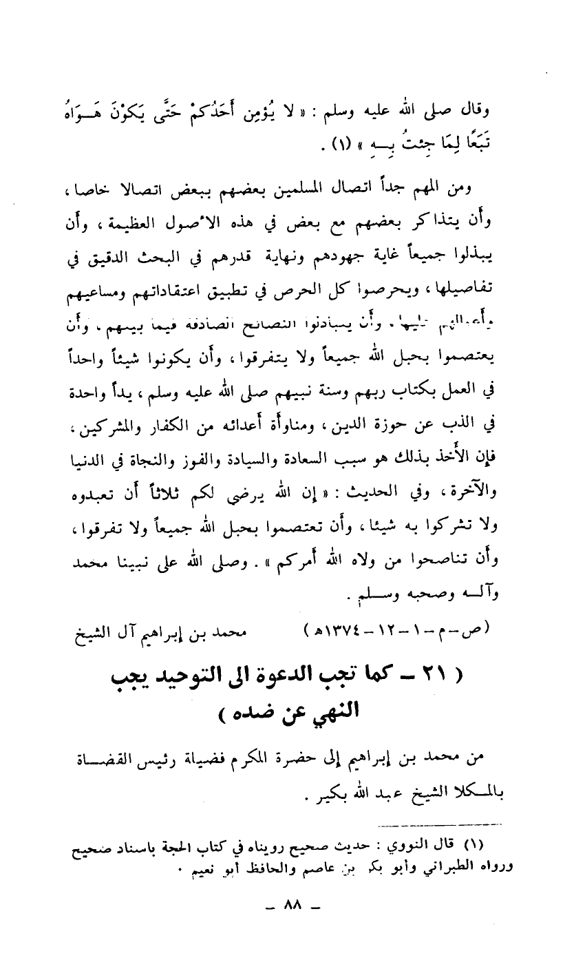 ومن المهم جدًا اتصال المسلمين بعضهم ببعض اتصالاً خاصًا، وأَن يتذاكر بعضهم مع بعض في هذه الأصول العظيمة، وأَن يبذلوا جميعًا غاية جهودهم ونهاية قدرهم في البحث الدقيق في تفاصيلها، ويحرصوا كل الحرص في تطبيق اعتقاداتهم ومساعيهم وأَعمالهم عليها، وأَن يتبادلوا النصائح الصادقة فيما بينهم، وأَن يعتصموا بحبل الله جميعًا ولا يتفرقوا، وأَن يكونوا شيئًا واحدًا في العمل بكتاب ربهم وسنة نبيهم صلى الله عليه وسلم، يدًا واحدة في الذب عن حوزة الدين، ومناوأَة أَعدائه من الكفار والمشركين، فإن الأَخذ بذلك هو سبب السعادة والسيادة والفوز والنجاة في الدنيا والآخرة، وفي الحديث: ((إن الله يرضى لكم ثلاثًا أَن تعبدوه ولا تشركوا به شيئًا، وأَن تعتصموا بحبل الله جميعًا ولا تفرقوا، وأَن تناصحوا من ولاه الله أَمركم)) . وصلى الله على نبينا محمد وآله وصحبه وسلم.