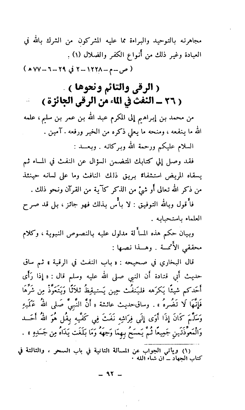 فقد وصل إلي كتابك المتضمن السؤال عن النفث في الماء ثم يسقاه المريض استشفاءً بريق ذلك النافث وما على لسانه حينئذ من ذكر الله تعالى أو شيء من الذكر كآية من القرآن ونحو ذلك.
