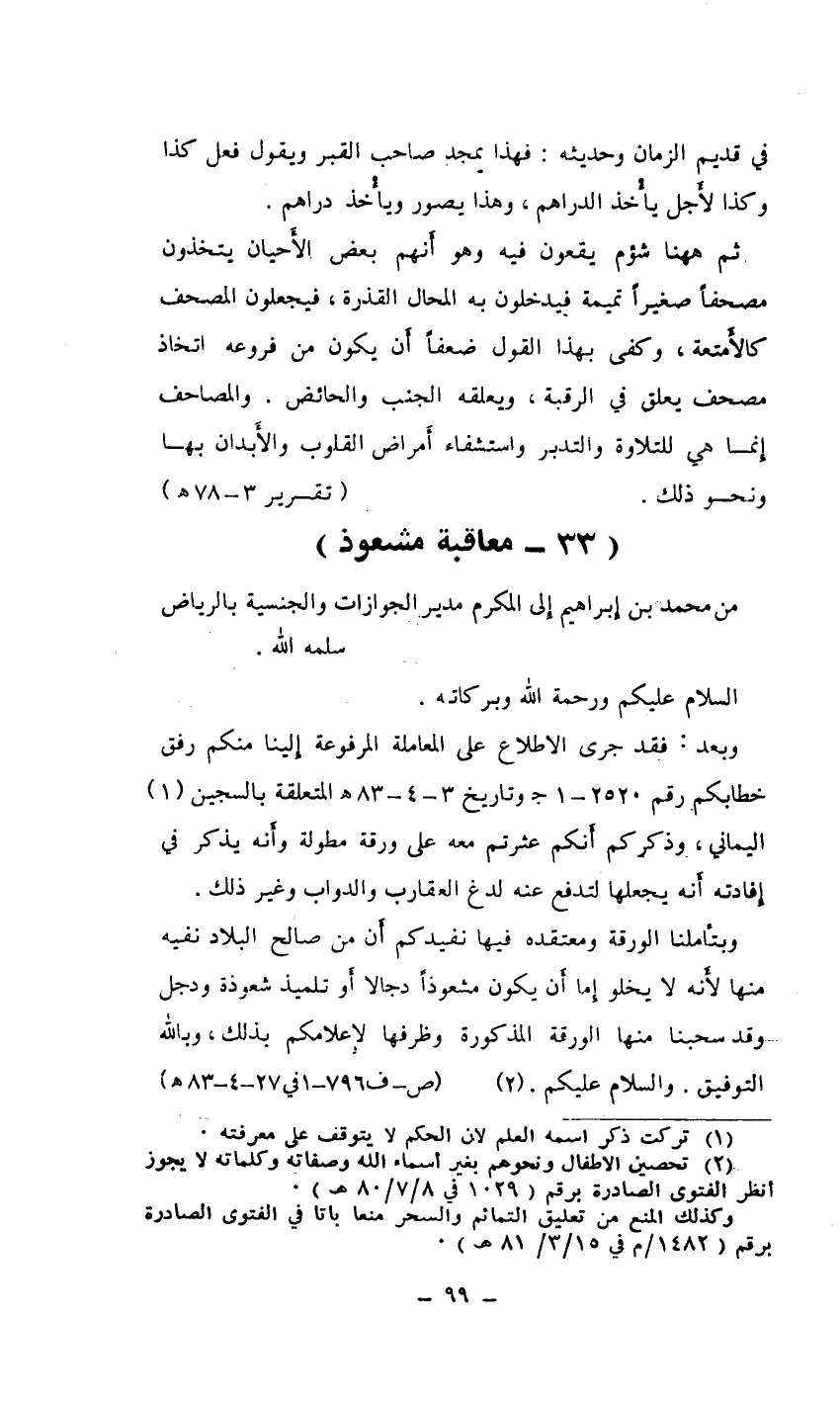 وبتأملنا الورقة ومعتقده فيها نفيدكم أَن من صالح البلاد نفيه منها لأَنه لا يخلو إما أَن يكون مشعوذًا دجالاً أو تلميذ شعوذة ودجل وقد سحبنا منها الورقة المذكورة وظرفها لإعلامكم بذلك، وبالله التوفيق. والسلام عليكم (¬2) ... (ص-ف796-1 في 27-4-83هـ)