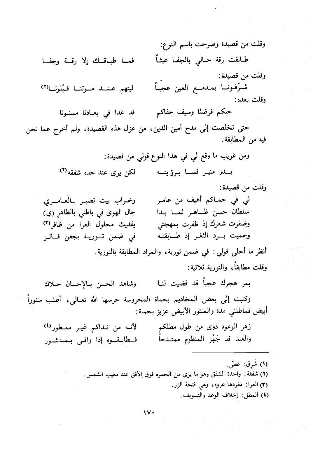 حتى تخلصت إلى مدح أمين الدين، من غزل هذه القصيدة، ولم أخرج عما نحن فيه من المطابقة. ومن غريب ما وقع لي في هذا النوع قولي من قصيدة: