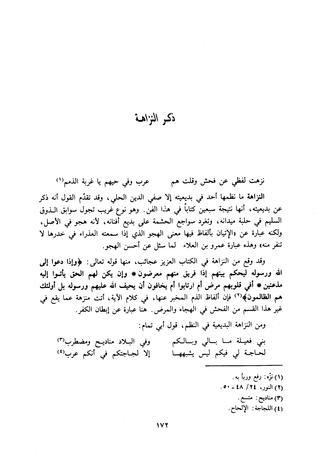وقد وقع من النزاهة في الكتاب العزيز عجائب، منها قوله تعالى: {وَإِذَا دُعُوا إِلَى اللَّهِ وَرَسُولِهِ لِيَحْكُمَ بَيْنَهُمْ إِذَا فَرِيقٌ مِنْهُمْ مُعْرِضُونَ، وَإِنْ يَكُنْ لَهُمُ الْحَقُّ يَأْتُوا إِلَيْهِ مُذْعِنِينَ، أَفِي قُلُوبِهِمْ مَرَضٌ أَمِ ارْتَابُوا أَمْ يَخَافُونَ أَنْ يَحِيفَ اللَّهُ عَلَيْهِمْ وَرَسُولُهُ بَلْ أُولَئِكَ هُمُ الظَّالِمُونَ} 2 فإن ألفاظ الذم المخبر عنها، في كلام الآية، أتت منزهة عما يقع في غير هذا القسم من الفحش في الهجاء والمرض. هنا عبارة عن إبطان الكفر.