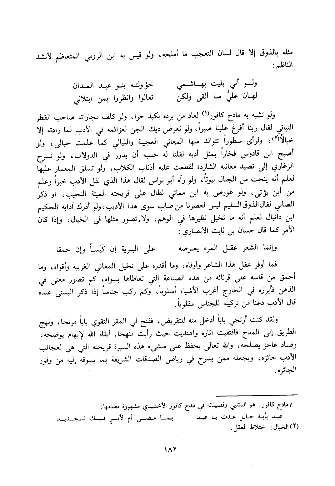فما أوفر عقل هذا الشاعر وأوفاه، وما أقدره على تخيل المعاني الغريبة وأقواه، وما أحمق من قاسه على قرنائه من هذه الصناعة التي تعاطاها بسواه، كم تصور معنى في الذهن فأبرزه في الخارج أغرب الأشياء أسلوبًا، وكم ركب جناسًا إذا ذكر البستي عنده قال الأدب دعنا من تركيبه للجناس مقلوبًا.