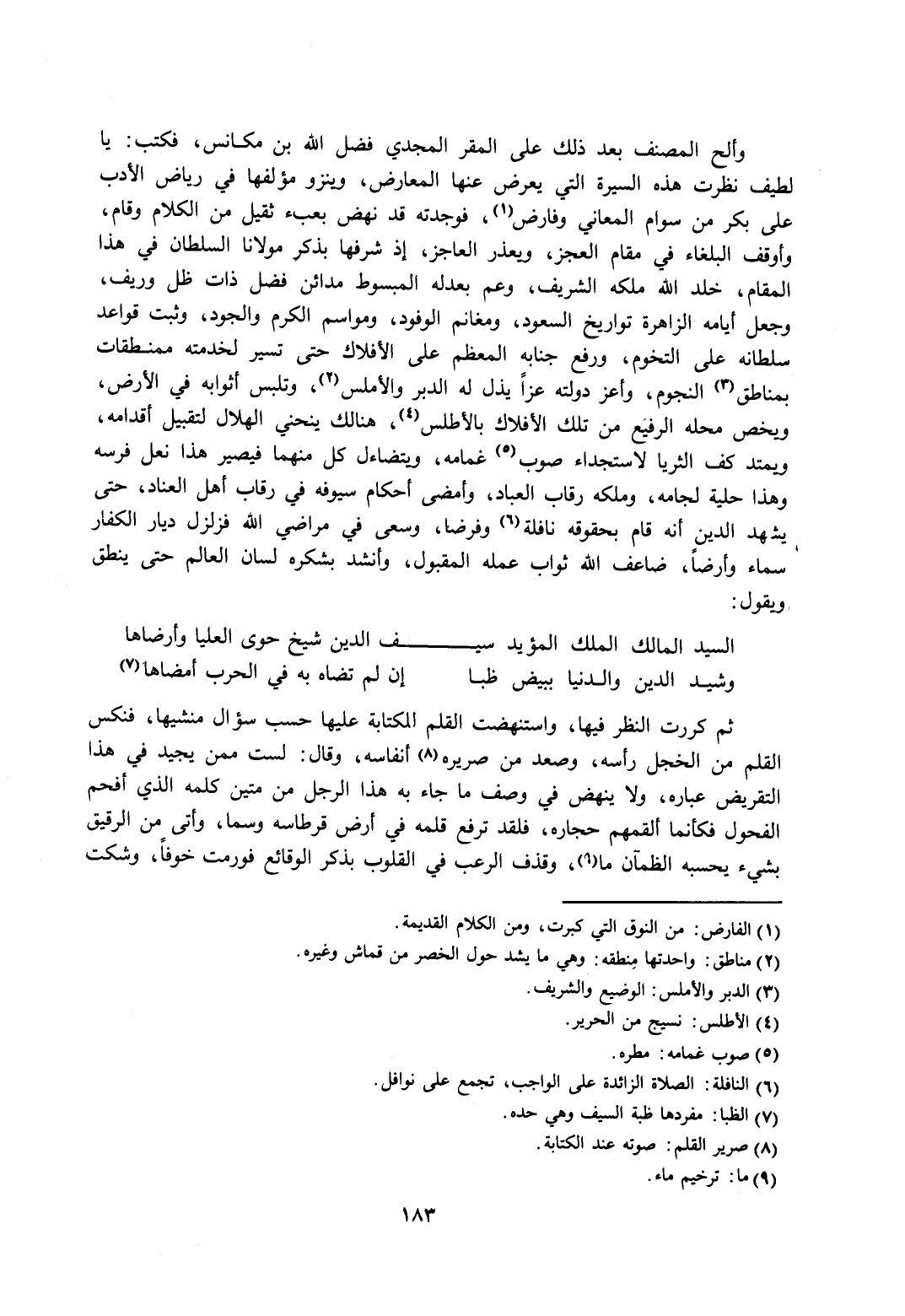وألح المصنف بعد ذلك على المقر المجدي فضل الله بن مكانس، فكتب: يا لطيف نظرت هذه السيرة التي يعرضه عنها المعارض، وينزو مؤلفها في رياض الأدب على بكر من سوام المعاني وفارض1. فوجدته قد نهض بعبء ثقيل من الكلام وقام، وأوقف البلغاء في مقام العجز، ويعذر العاجز، إذ شرفها بذكر مولانا السلطان في هذا المقام، خلد الله ملكه الشريف، وعم بعدله المبسوط مدائن فضل ذات ظل وريف، وجعل أيامه الزاهرة تواريخ السعود، ومغانم الوفود، ومواسم الكرم والجود، وثبت قواعد سلطانه على التخوم، ورفع جنابه المعظم على الأفلاك حتى تسير لخدمته ممنطقات بمناطق3 النجوم، وأعز دولته عزًا يذل له الدبر والأملس2، وتلبس أثوابه في الأرض، ويخص محله الرفيع من تلك الأفلاك بالأطلس4، هنالك ينحني الهلال لتقبيل أقدامه، ويمتد كف الثريا لاستجداء صوب5 غمامه، ويتضاءل كل منهما فيصير هذا نعل فرسه وهذا حلية لجامه، وملكه رقاب العباد، وأمضى أحكام سيوفه في رقاب أهل العناد، حتى يشهد الدين أنه قام بحقوقه نافلة6 وفرضًا، وسعى في مراضي الله فزلزل ديار الكفار سماء وأرضًا، ضاعف الله ثواب عمله المقبول، وأنشد بشكره لسان العالم حتى ينطق ويقول:
