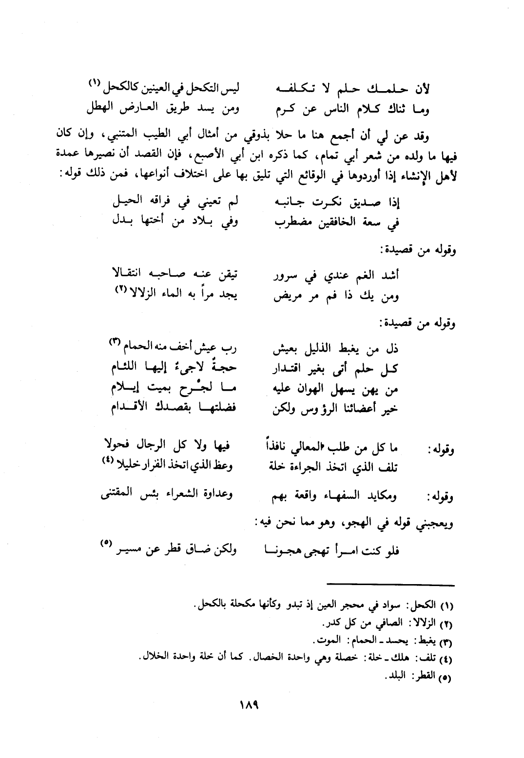 وقد عن لي أن أجمع هنا ما حلا بذوقي من أمثال أبي الطيب المتنبي، وإن كان فيها ما ولده من شعر أبي تمام، كما ذكره ابن أبي الأصبع، فإن القصد أن نصيرها عمدة لأهل الإنشاء إذا أوردوها في الوقائع التي تليق بها على اختلاف أنواعها، فمن ذلك قوله:
