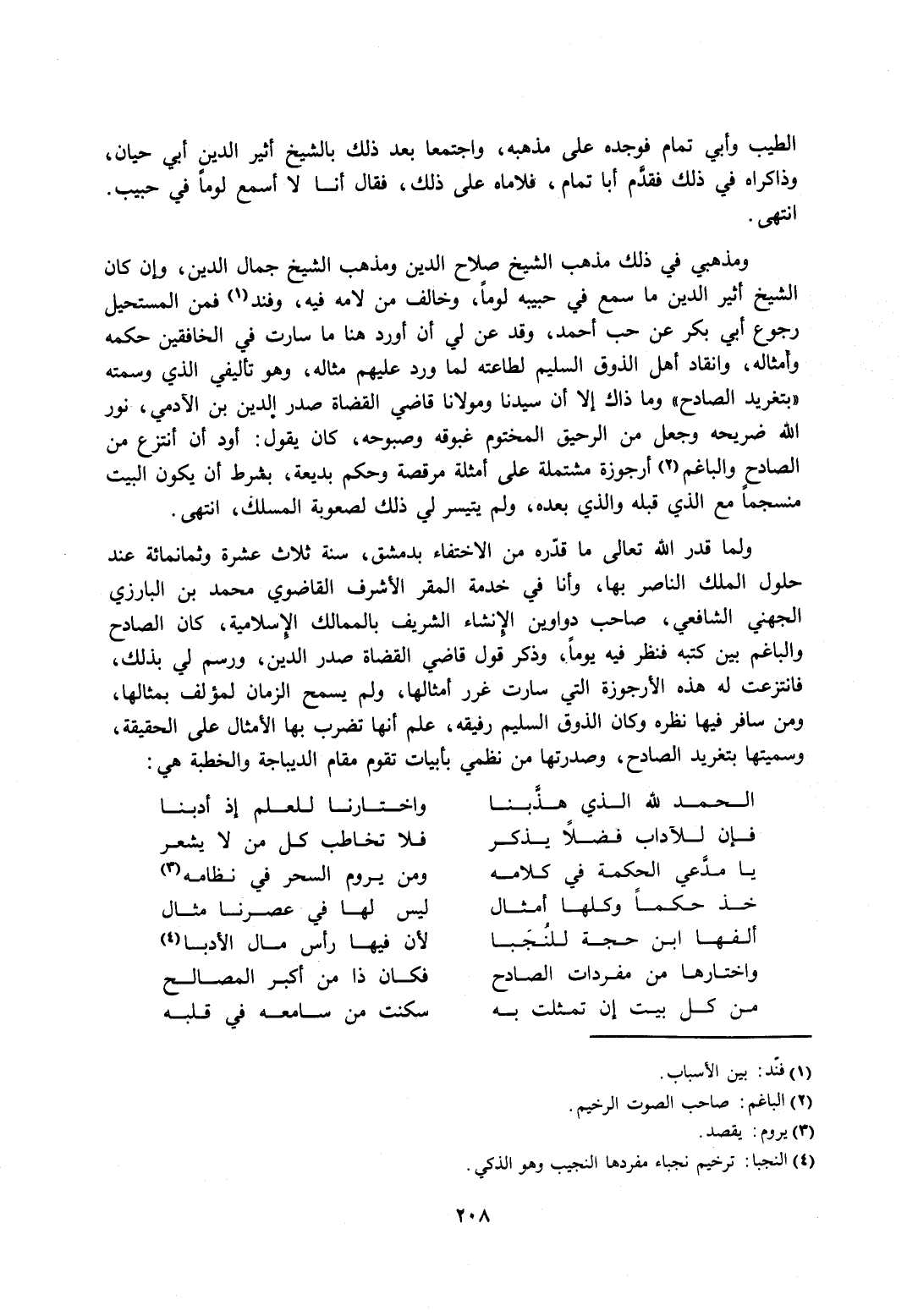 ومذهبي في ذلك مذهب الشيخ صلاح الدين ومذهب الشيخ جمال الدين، وإن كان الشيخ أثير الدين ما سمع في حبيبه لومًا، وخالف من لامه فيه، وفند1 فمن المستحيل رجوع أبي بكر عن حب أحمد، وقد عن لي أن أورد هنا ما سارت في الخافقين حكمه وأمثاله، وانقاد أهل الذوق السليم لطاعته لما ورد عليهم مثاله، وهو تأليفي الذي وسمته "بتغريد الصادح" وما ذاك إلا أن سيدنا ومولانا قاضي القضاة صدر الدين بن الآدمي، نور الله ضريحه وجعل من الحريق المختوم غبوقه وصبوحه، كان يقول: أورد أن أنتزع من الصادق والباغم2 أرجوزة مشتملة على أمثلة مرقصة وحكم بديعة، بشرط أن يكون البيت مسنجمًا مع الذي قبله والذي بعده، ولم يتيسر لي ذلك لصعوبة المسلك، انتهى.
