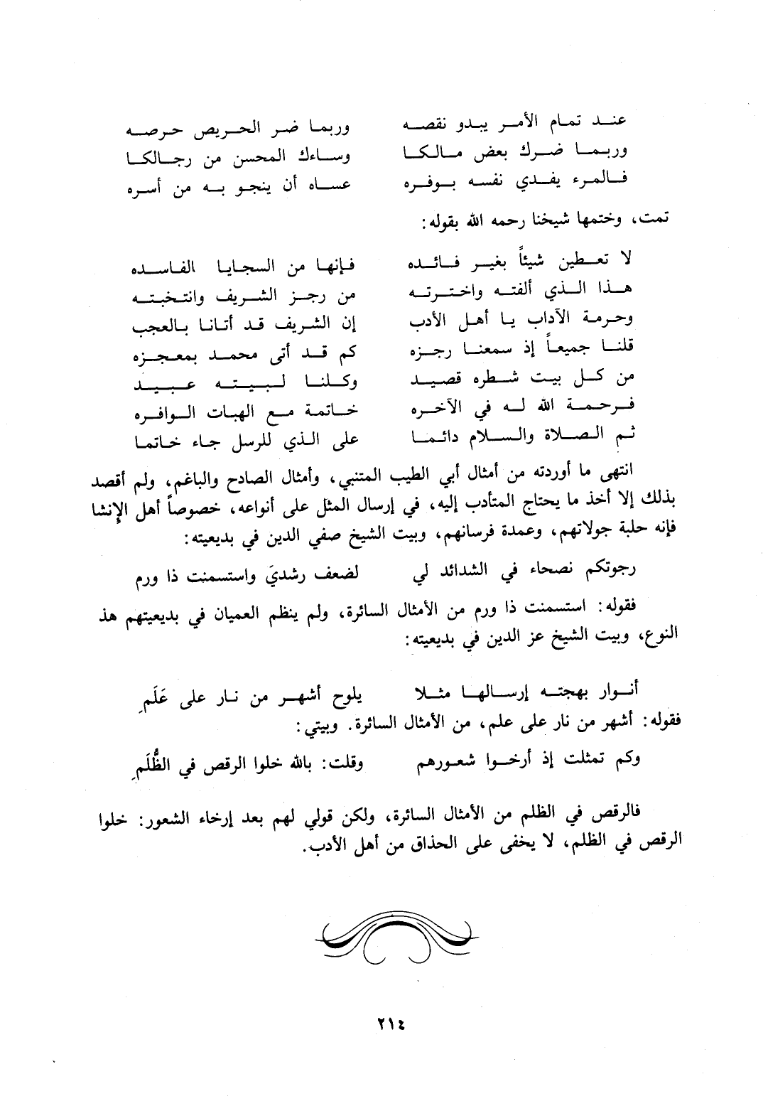 انتهى ما أوردته من أمثال أبي الطيب المتنبي، وأمثال الصادح والباغم، ولم أقصد بذلك إلا أخذ ما يحتاج المتأدب إليه، في إرسال المثل على أنواعه، خصوصًا أهل الإنشاء فإنه حلبة جولاتهم، وعمدة فرسانهم، وبيت الشيخ صفي الدين في بديعيته: