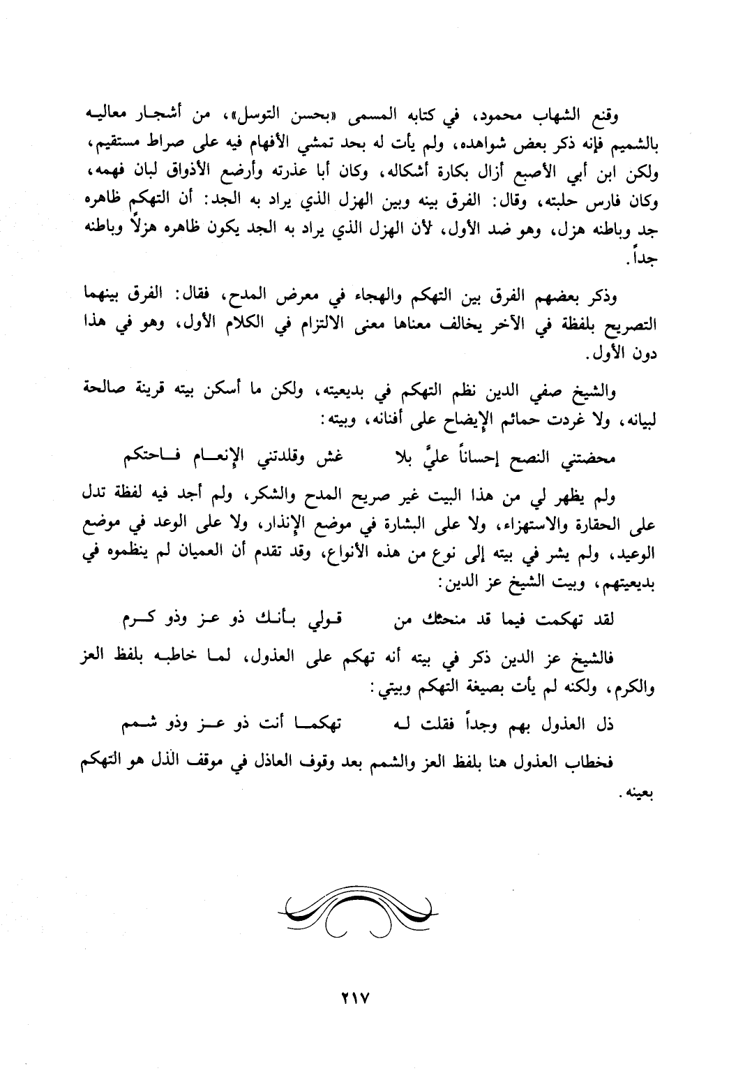 والشيخ صفي الدين نظم التهكم في بديعيته، ولكن ما أسكن بيته قرينة صالحة لبيانه، ولا غردت حمائم الإيضاح على أفنانه، وبيته: