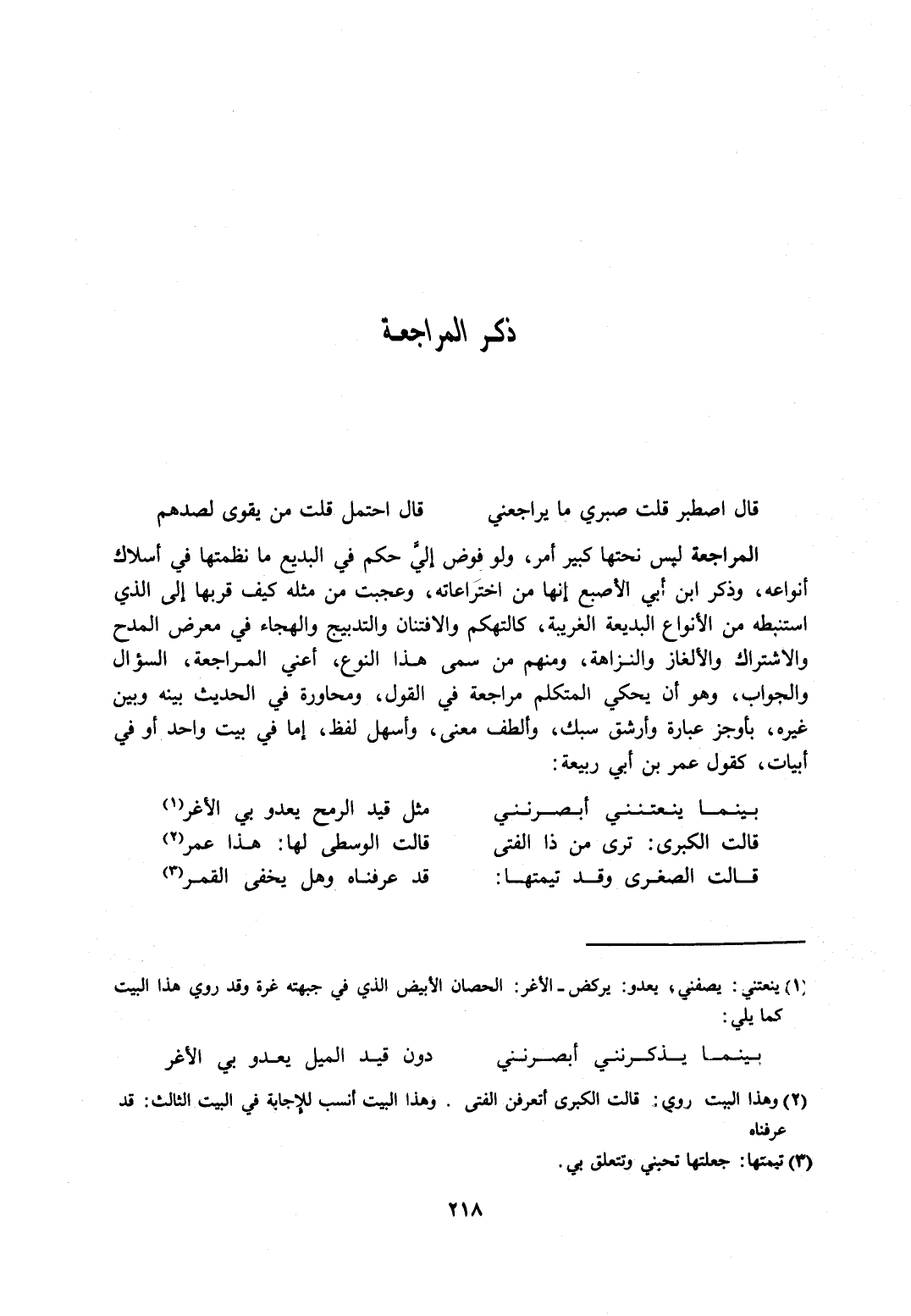 المراجعة ليس نحتها كبير أمر، ولو فوض إليَّ حكم في البديع ما نظمتها في أسلاك أنواعه، وذكر ابن أبي الأصبع أنها من اختراعاته، وعجبت من مثله كيف قربها إلى الذي استنبطه من الأنواع البديعية الغريبة، كالتهكم والافتنان والتدبيج والهجاء في معرض المدح والاشتراك والألغاز والنزاهة، ومنهم من سمى هذاالنوع، أعني المراجعة، السؤال والجواب، وهو أن يحكي المتكلم مراجعة في القول، ومحاورة في الحديث بينه وبين غيره، بأوجز عبارة وأرشق سبك، وألطف معنى، وأهس لفظ، إما في بيت واحد أو في أبيات، كقول عمر بن أبي ربيعة: