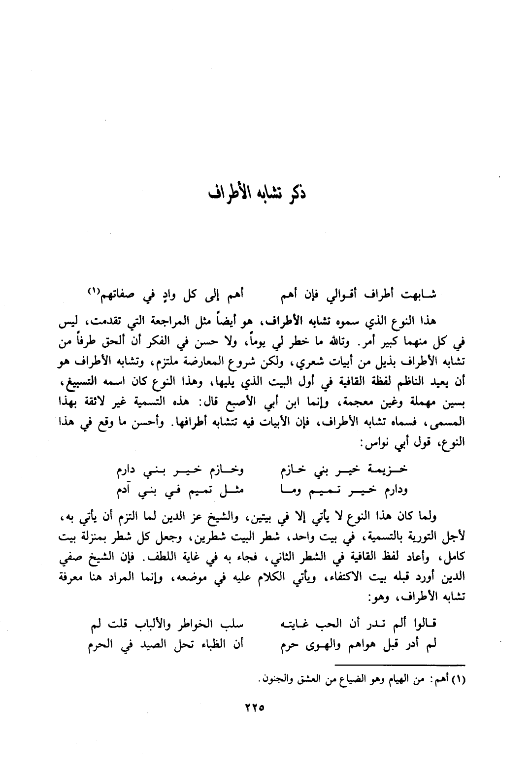 هذا النوع الذي سموه تشابه الأطراف، هو أيضًا مثل المراجعة التي تقدمت، ليس في كل منهما كبير أمر. وتالله ما خطر لي يومًا، ولا حسن في الفكر أن ألحق طرفًا من تشابه الأطراف بذيل من أبيات شعري ولكن شروع المعارضة ملتزم، وتشابه الأطراف هو أن يعيد الناظم لفظة القافية في أول البيت الذي يليها، وهذا النوع كان اسمه التسبيغ، بسين مهملة وغين معجمة، وإنما ابن أبي الأصبع قال: هذه التسمية غير لائقة بهذا المسمى، فسماه تشابه الأطراف، فإن الأبيات فيه تتشابه أطرافها. وأحسن ما وقع في هذا النوع، قول أبي نواس:
