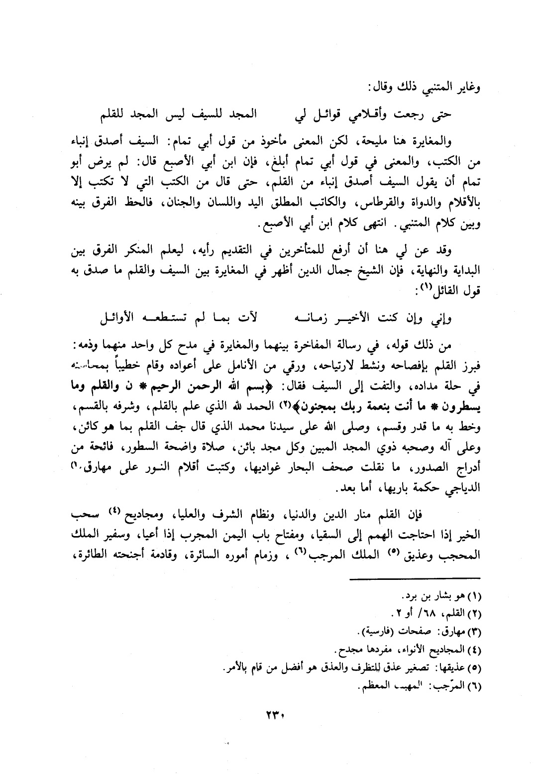 وقد عن لي هنا أن أرفع للمتأخرين في التقديم رأيه، ليعلم المنكر الفرق بين البداية والنهاية، فإن الشيخ جمال الدين أظهر في المغايرة بين السيف والقلم ما صدق به قول القائل1: