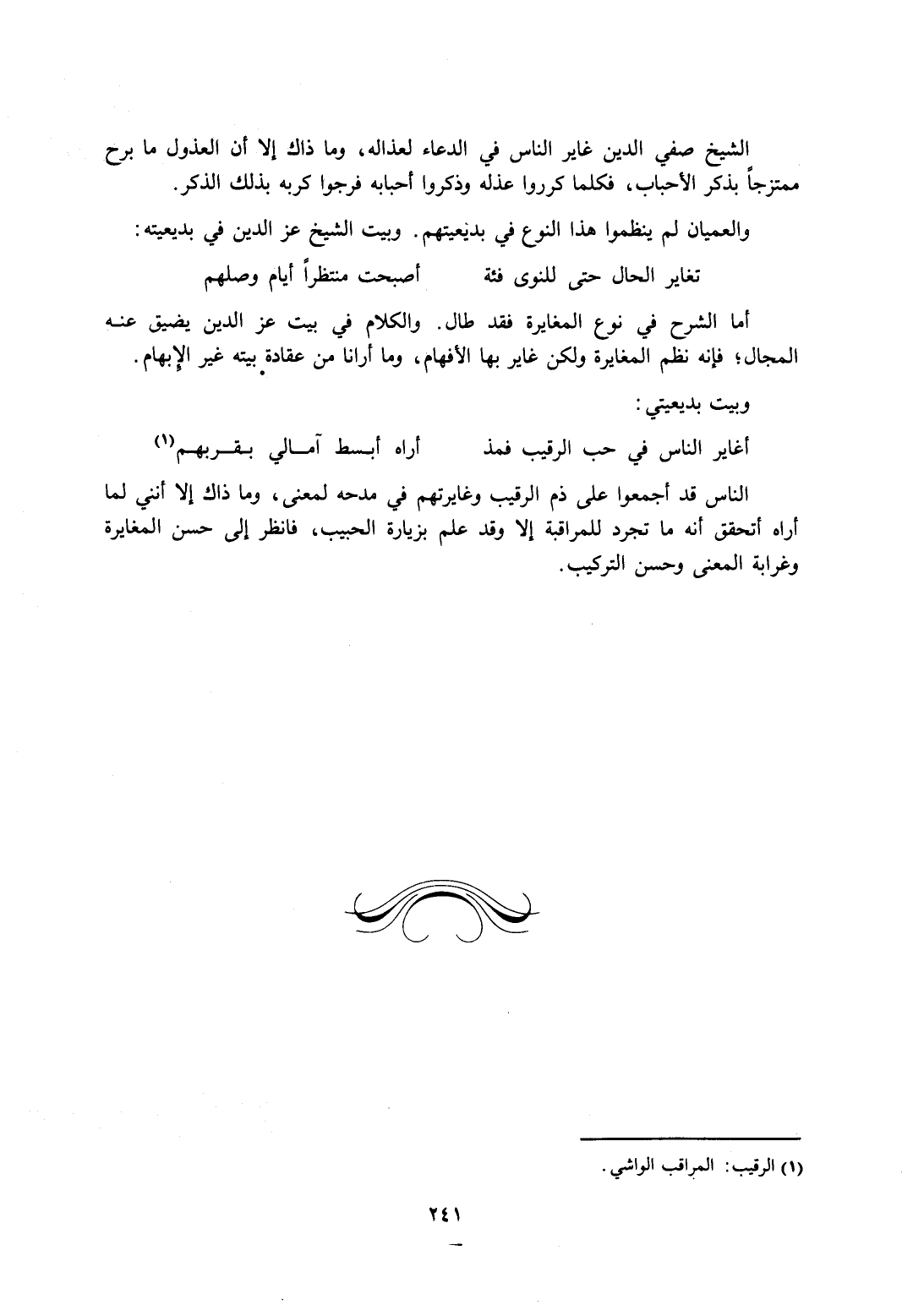 الناس قد أجمعوا على ذم الرقيب وغايرتهم في مدحه لمعنى، وما ذاك إلا أنني لما أراه أتحقق أنه ما تجرد للمراقبة إلا وقد علم بزيارة الحبيب، فانظر إلى حسن المغايرة وغرابة المعنى وحسن التركيب.